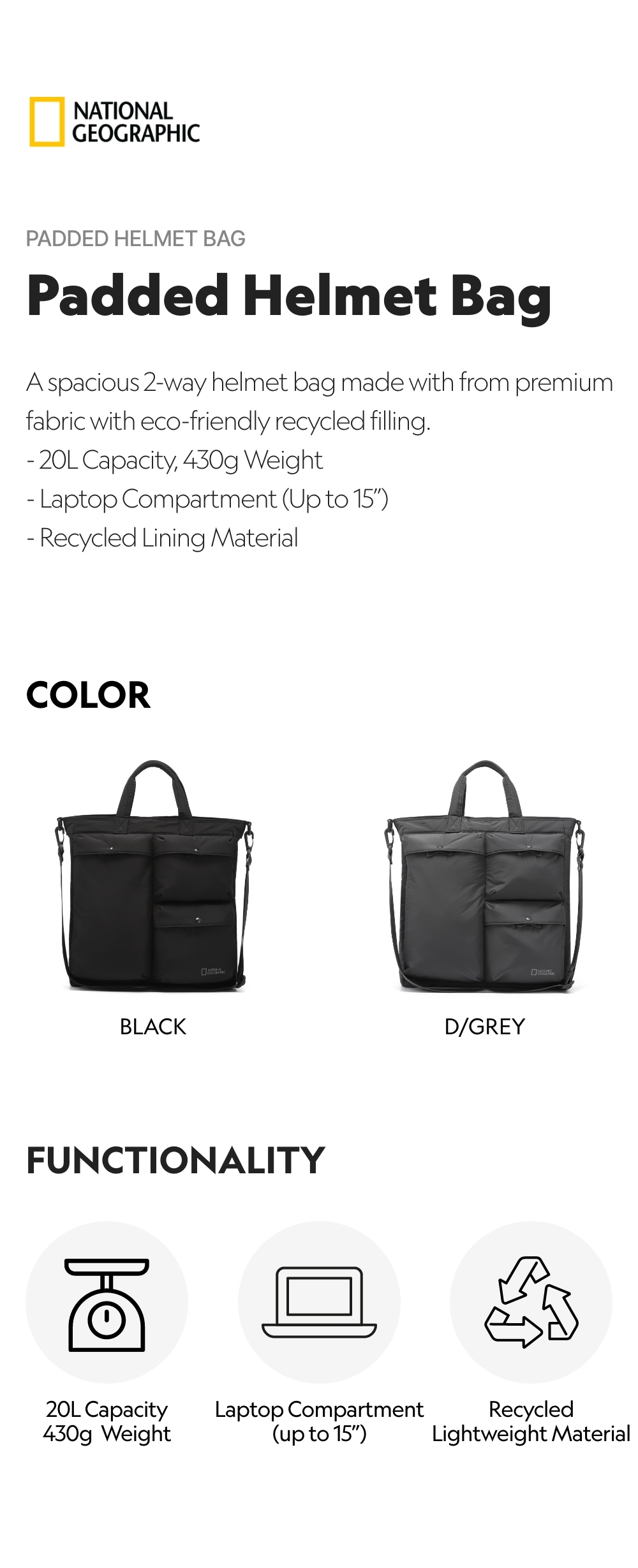 A spacious 2-way helmet bag made with from premium fabric with eco-friendly recycled filling.
