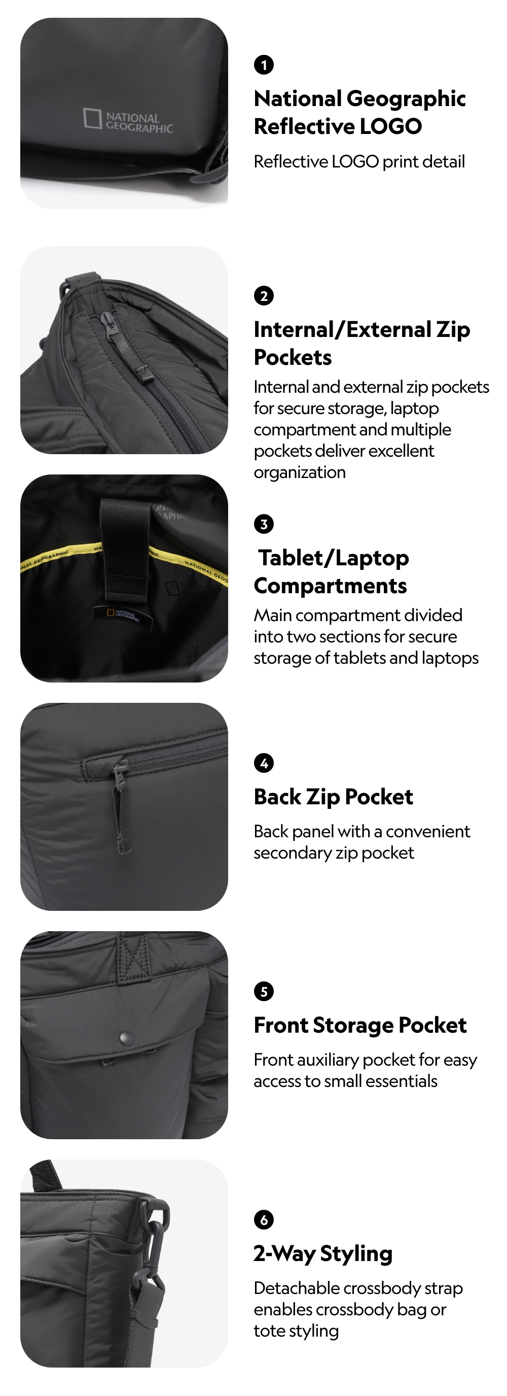 Internal and external zip pockets for secure storage, laptop compartment and multiple pockets deliver excellent organization