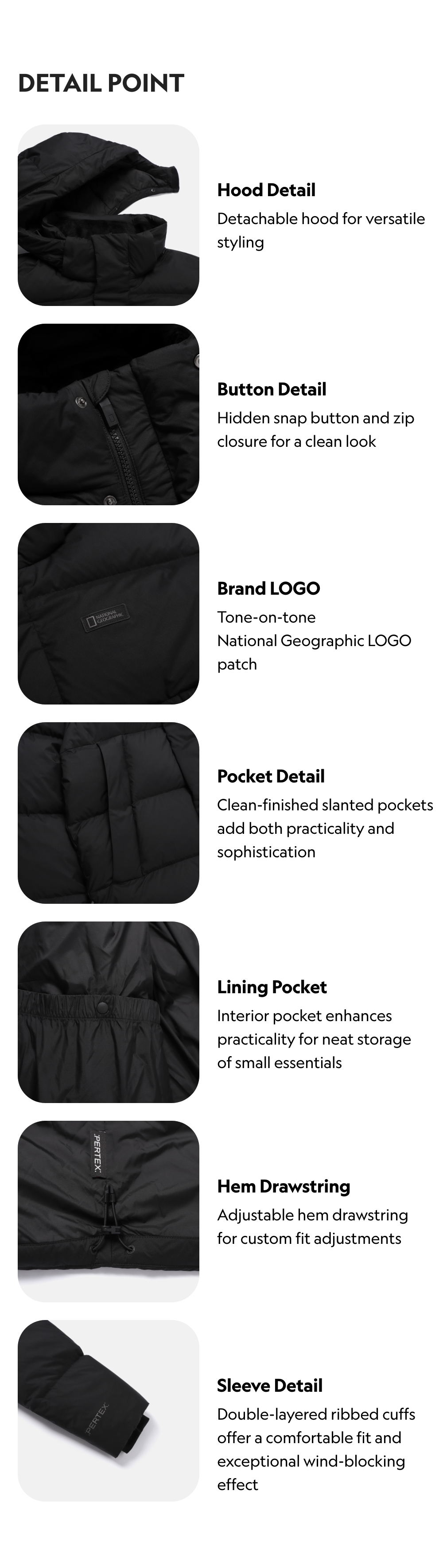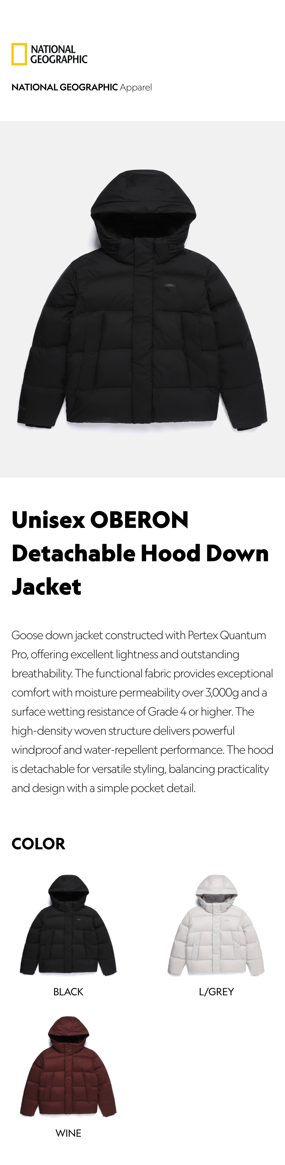 Goose down jacket constructed with Pertex Quantum Pro, offering excellent lightness and outstanding breathability. The functional fabric provides exceptional comfort with moisture permeability over 3,000g and a surface wetting resistance of Grade 4 or higher. The high-density woven structure delivers powerful windproof and water-repellent performance. The hood is detachable for versatile styling, balancing practicality and design with a simple pocket detail.