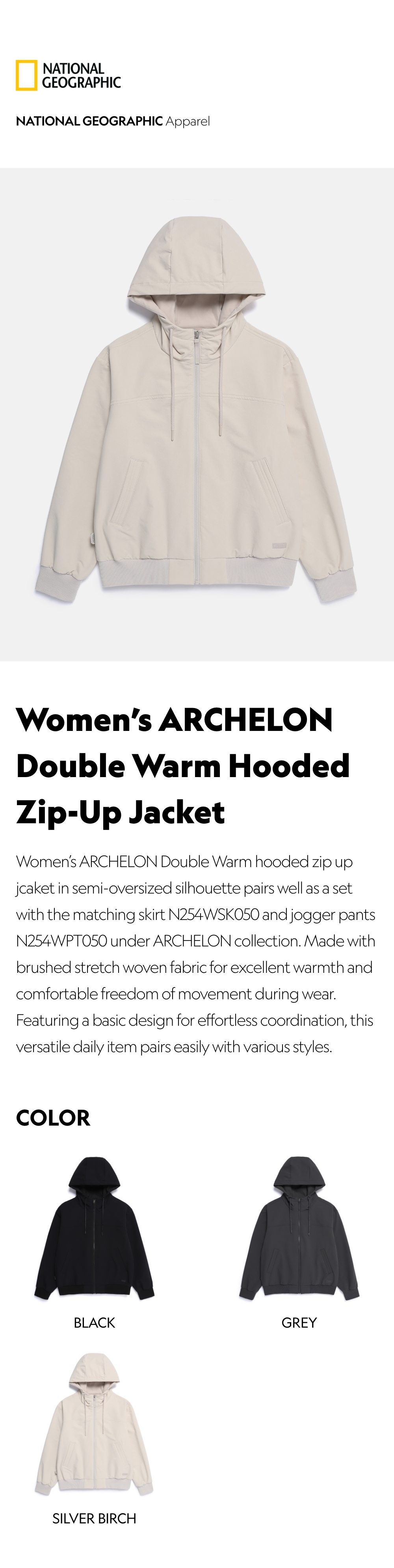 Women’s ARCHELON Double Warm hooded zip up jcaket in semi-oversized silhouette pairs well as a set with the matching skirt N254WSK050 and jogger pants N254WPT050 under ARCHELON collection.