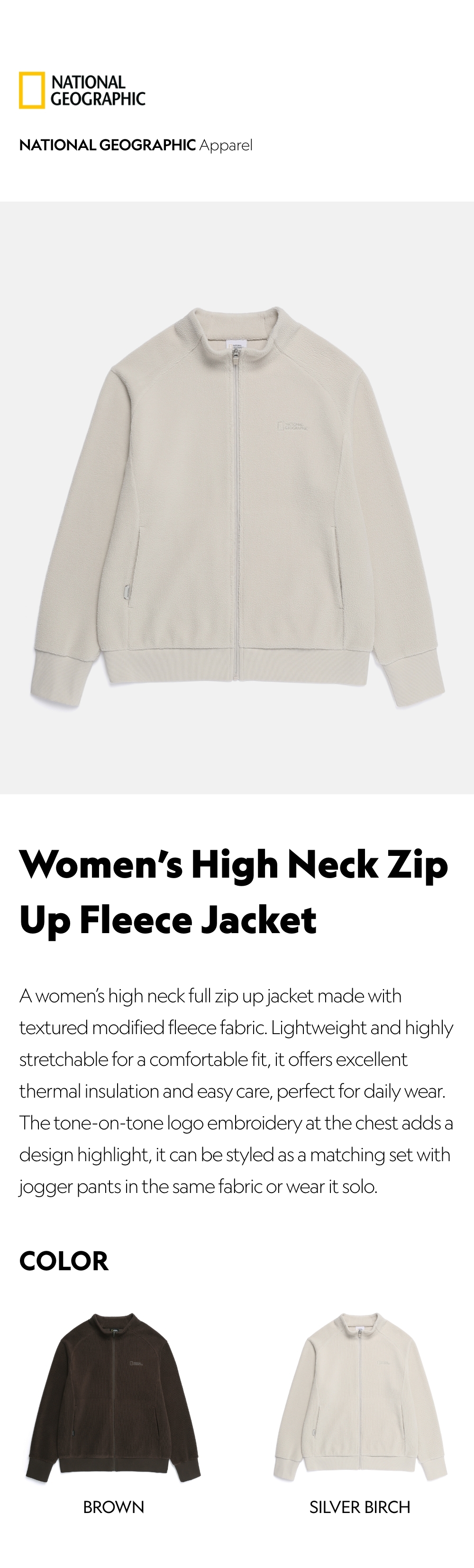 A women's high neck full zip up jacket made with textured modified fleece fabric.