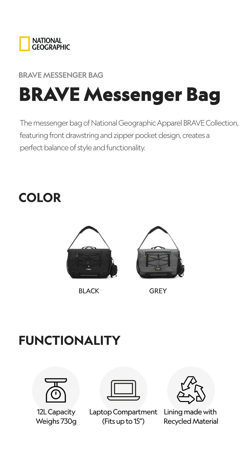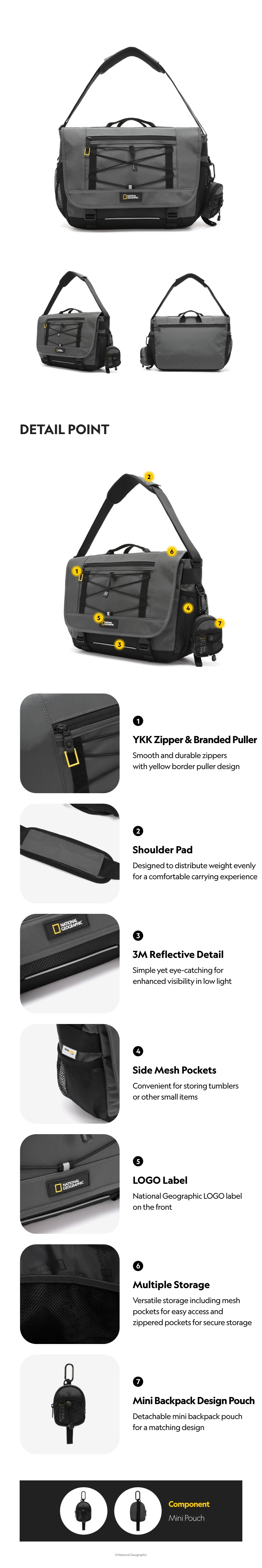 The messenger bag of National Geographic Apparel BRAVE Collection, featuring front drawstring and zipper pocket design, creates a perfect balance of style and functionality.