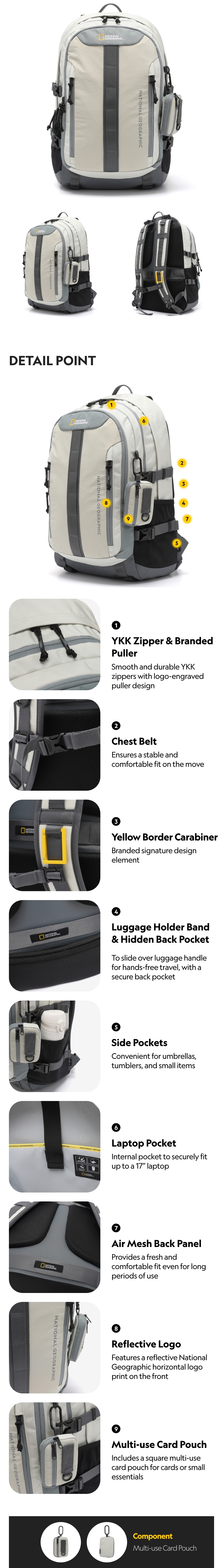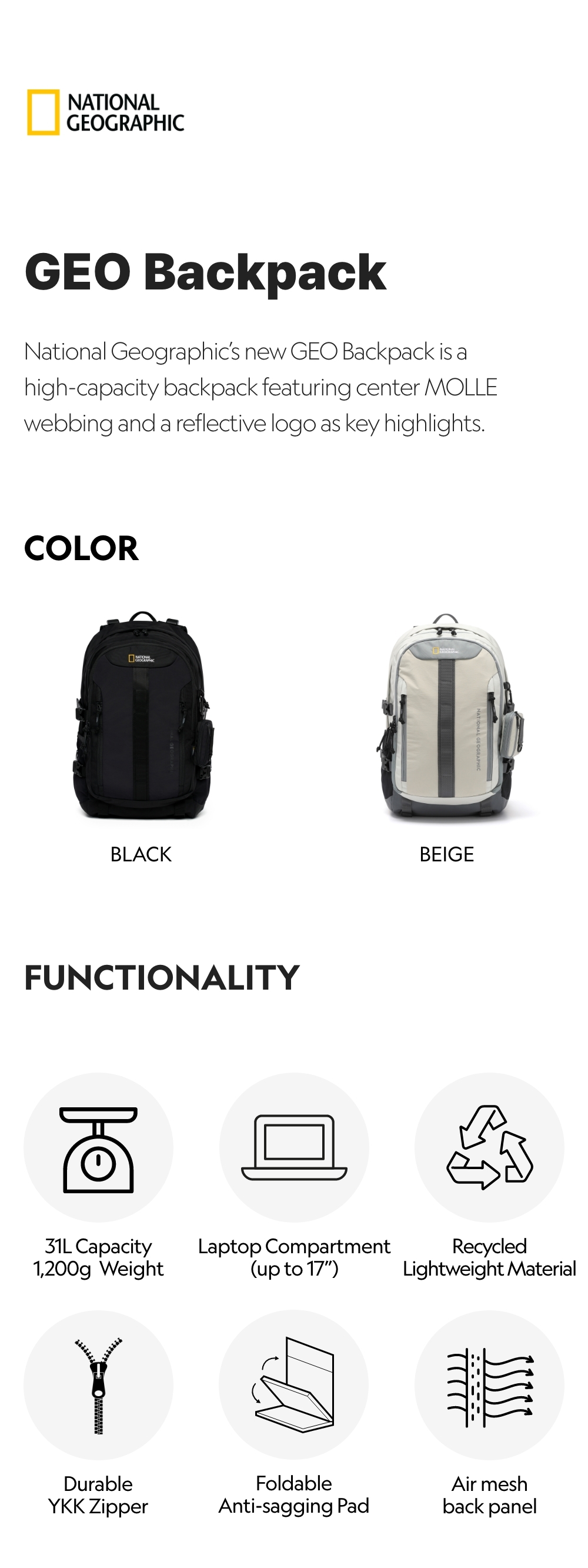 National Geographic's new GEO Backpack is a high-capacity backpack featuring center MOLLE webbing and a reflective logo as key highlights.