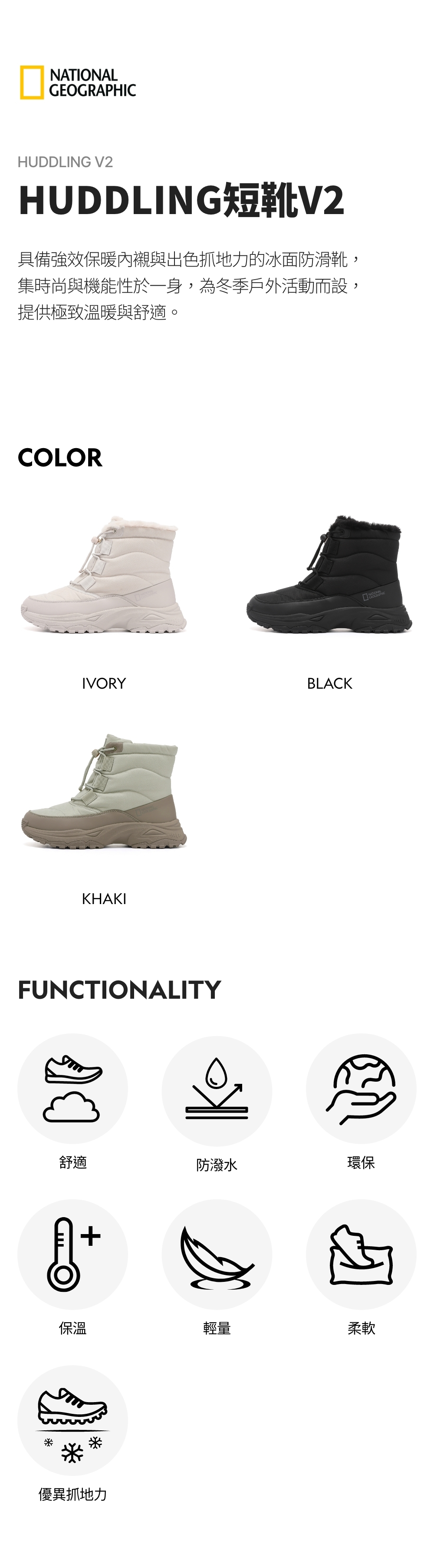 Featuring National Geographic's exclusive Ice-Lock outsole for enhanced slip resistance on icy surfaces, with an expanded contact area for exceptional non-slip performance
