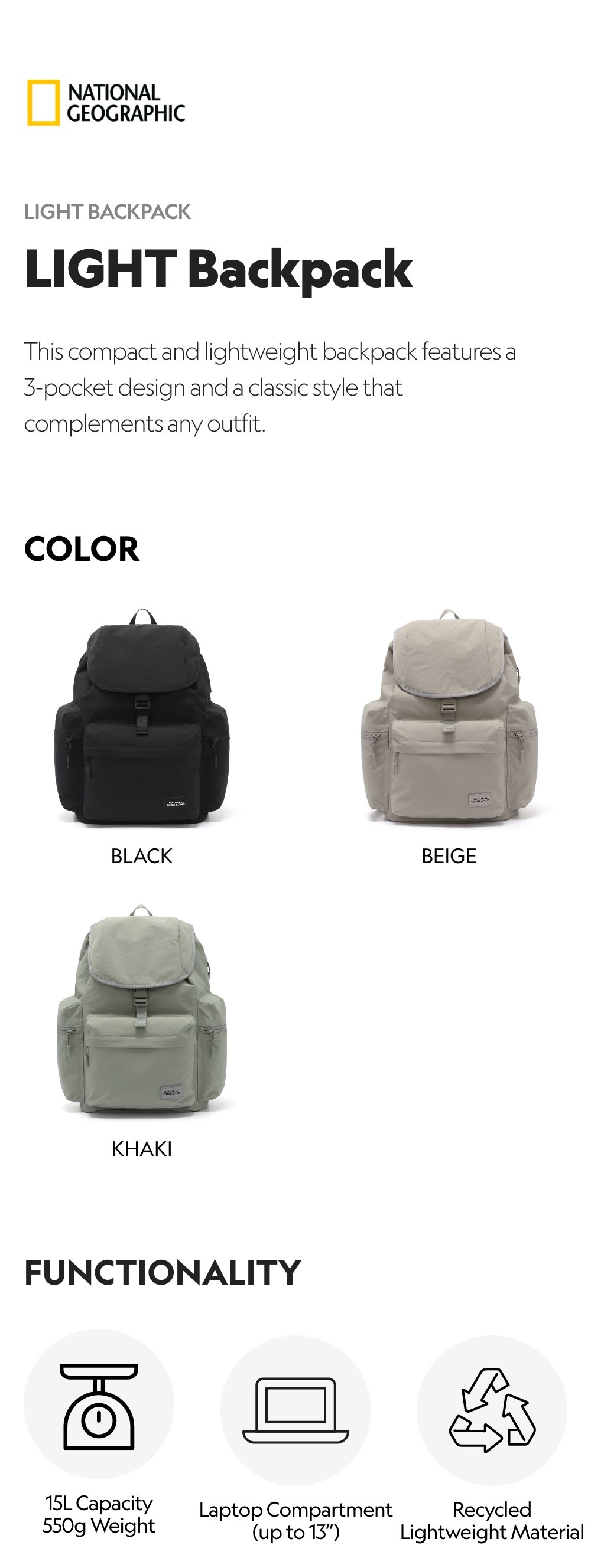 - This compact and lightweight backpack features a three-pocket design and a classic style that complements any outfit