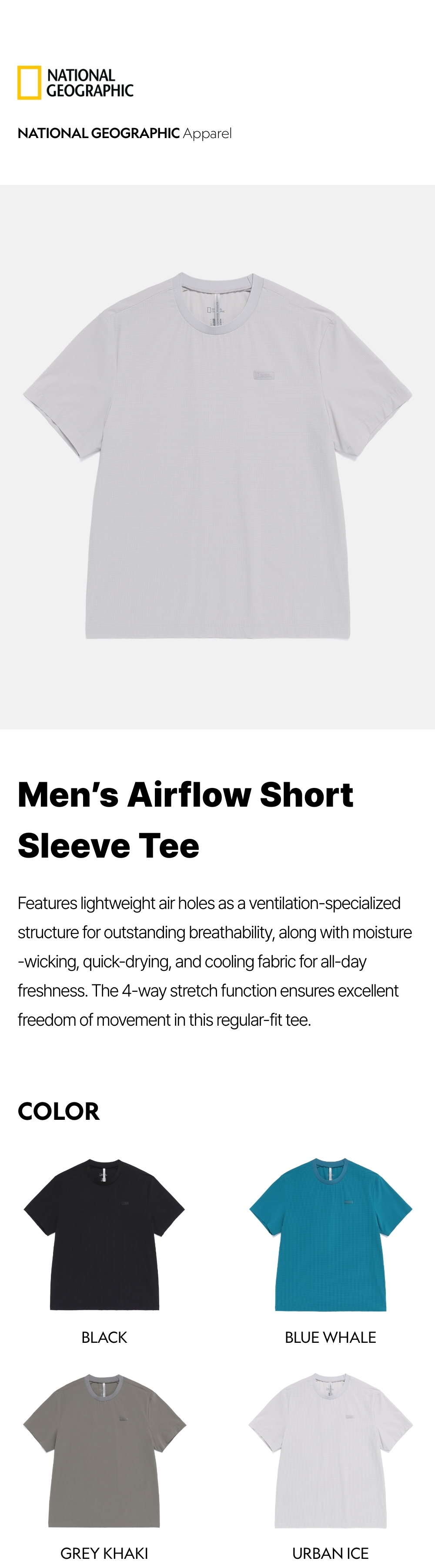 Features lightweight air holes as a ventilation-specialized structure for outstanding breathability, along with moisture-wicking, quick-drying, and cooling fabric for all-day freshness. The 4-way stretch function ensures excellent freedom of movement in this regular-fit tee.