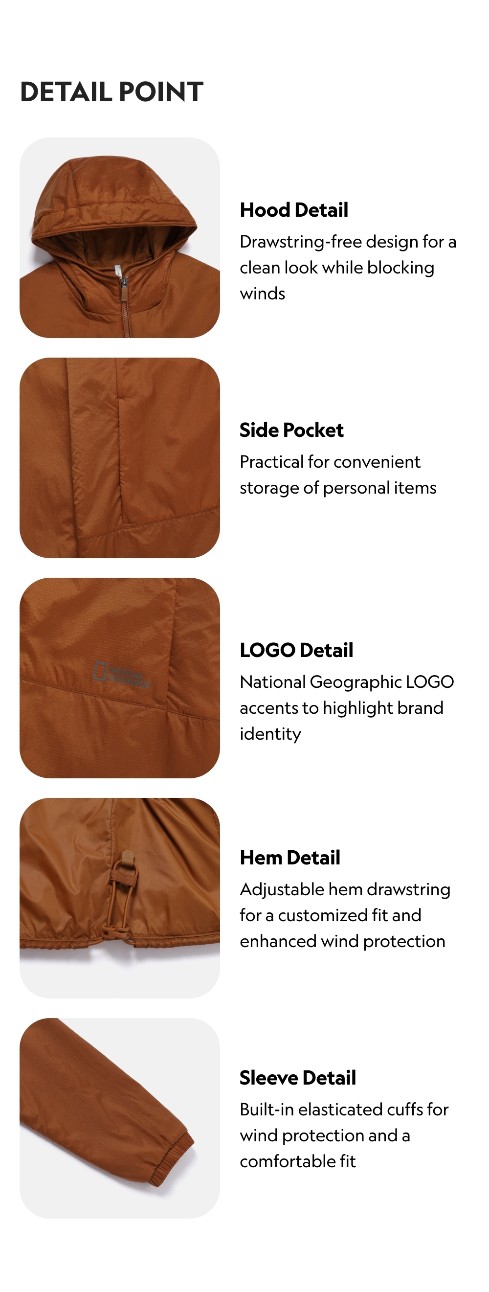 Drawstring-free design for a clean look while blocking winds