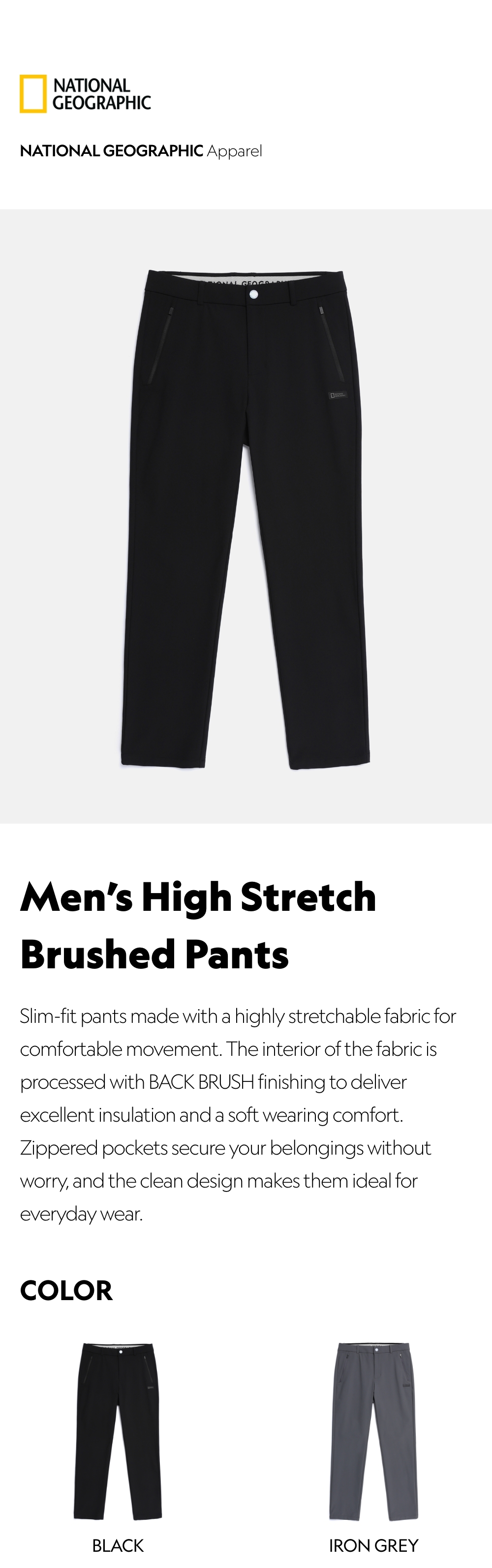 Slim-fit pants made with a highly stretchable fabric for comfortable movement. The interior of the fabric is processed with BACK BRUSH finishing to deliver excellent insulation and a soft wearing comfort. Zippered pockets secure your belongings without worry, and the clean design makes them ideal for everyday wear.