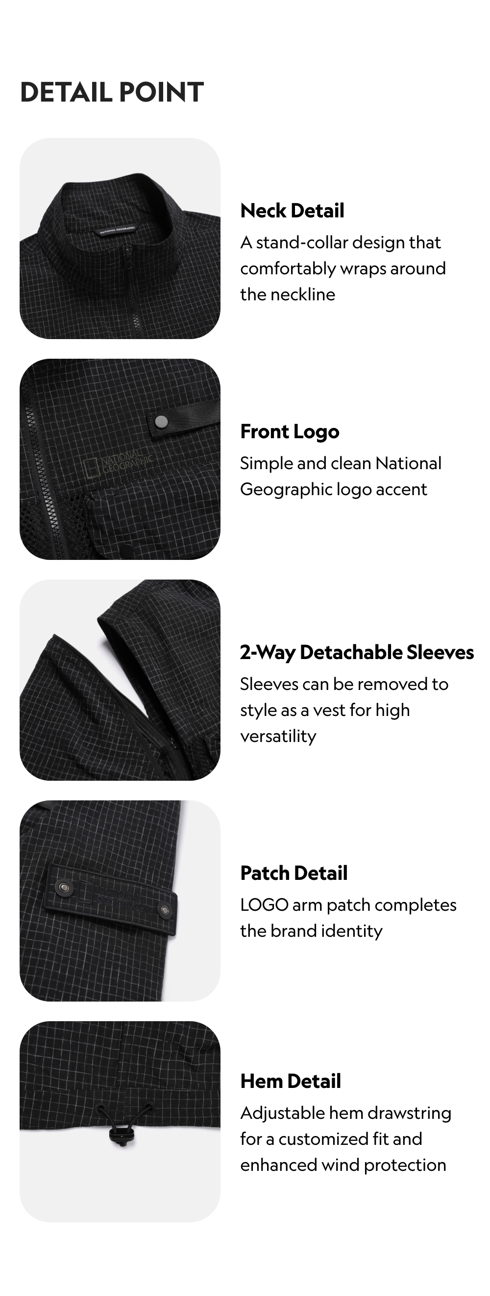 This versatile jacket features detachable sleeves that can be converted into a vest. The body incorporates large-hole mesh material to enhance breathability, ensuring a omfortable wear without stuffiness even during activities. Multiple pockets including side pockets provide versatile storage options for different user needs.