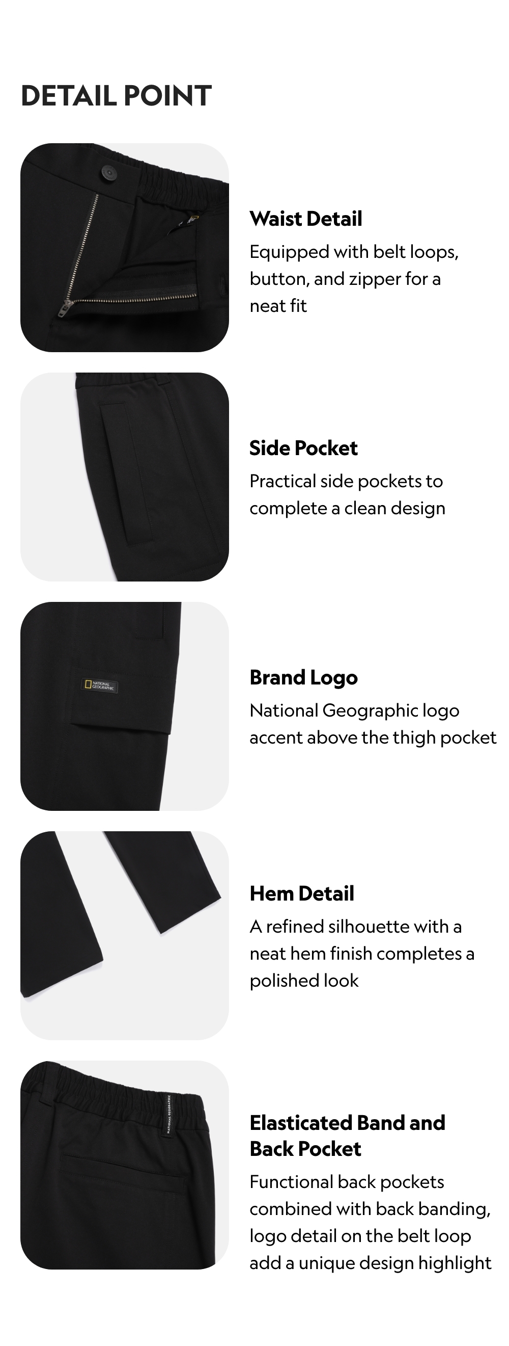 These basic-fit cargo pants with seam lines are made with high-stretch polyester fabric with a smooth surface and soft touch. It offers a moderately relaxed silhouette from the thigh to the hem for excellent mobility. Featuring an elasticated waistband and zipper fly, these pants are easy to wear and highly versatile for daily use.