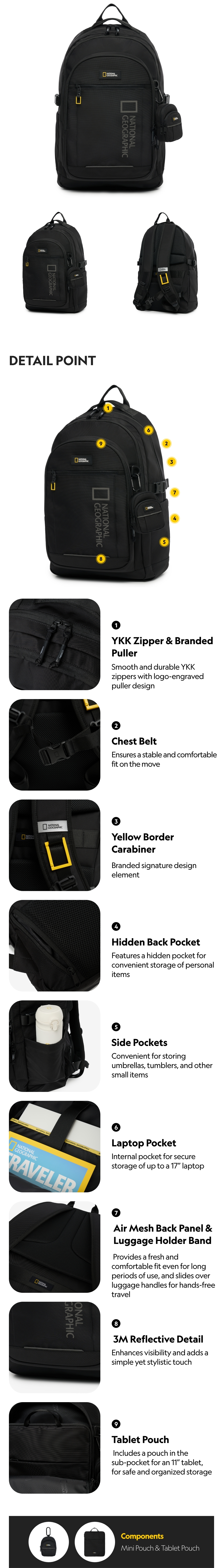 National Geographic's new MILD Backpack features a bold reflective big logo on the front as a key design highlight.