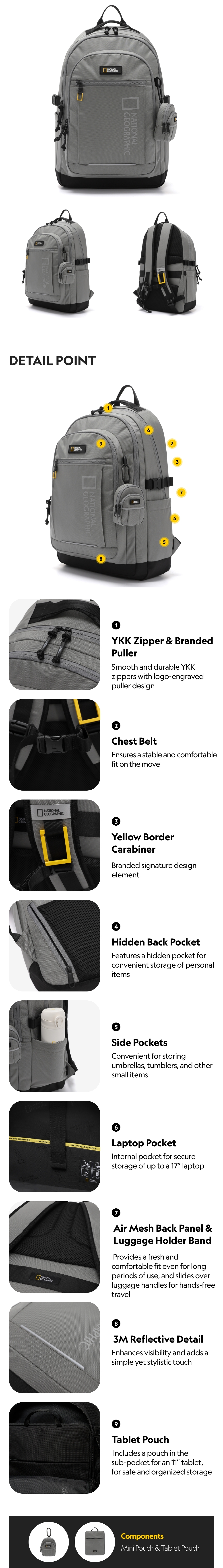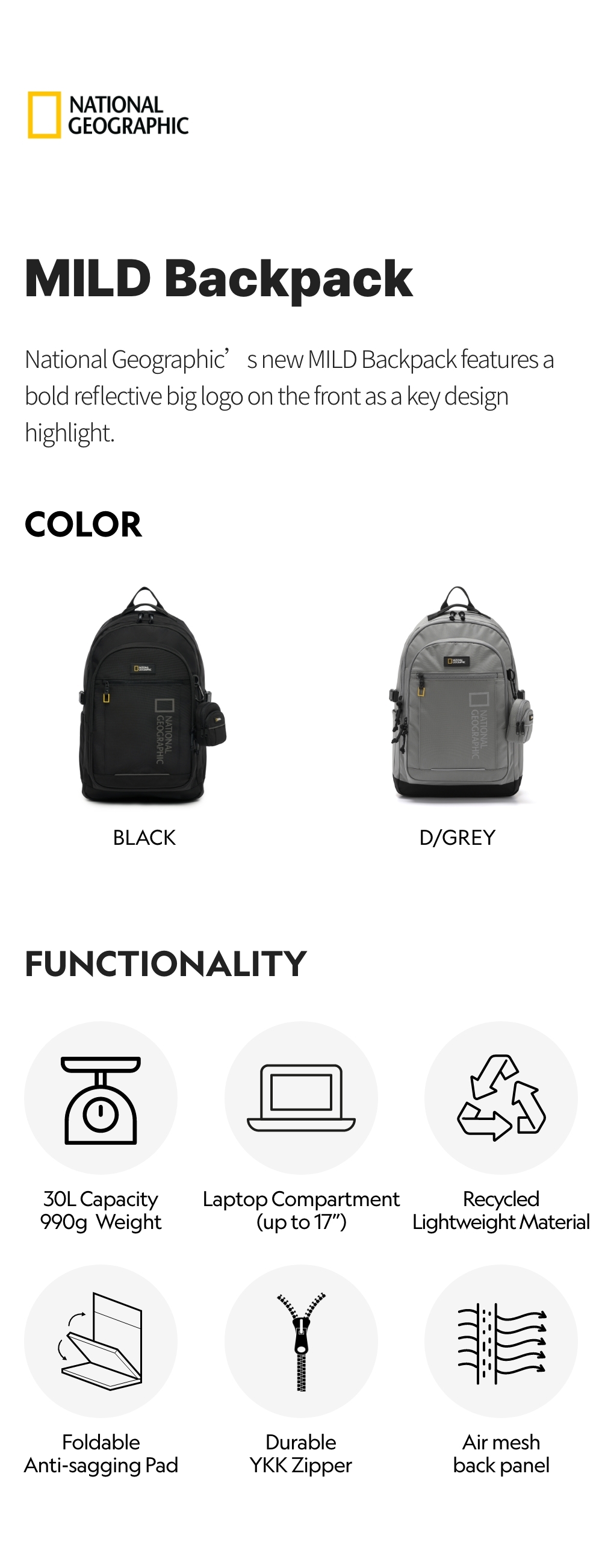 National Geographic's new MILD Backpack features a bold reflective big logo on the front as a key design highlight.