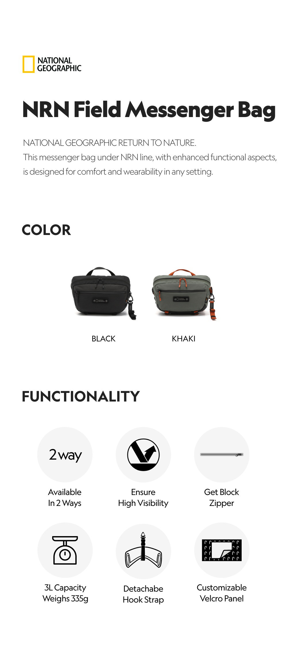 National Geographic Return to Nature. This messeger bag under NRN line, with enhanced functional aspects, is designed for comfort and wearability in any setting.