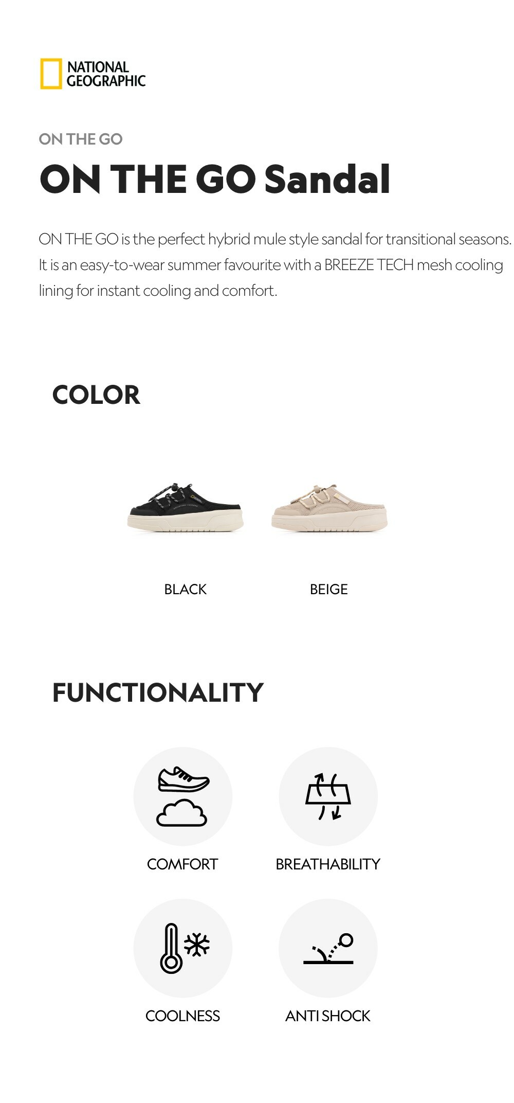 ON THE GO is the perfect hybrid mule style sandal for transitional seasons. It is an easy-to-wear summer favourite with a BREEZE TECH mesh cooling lining for instant cooling and comfort.