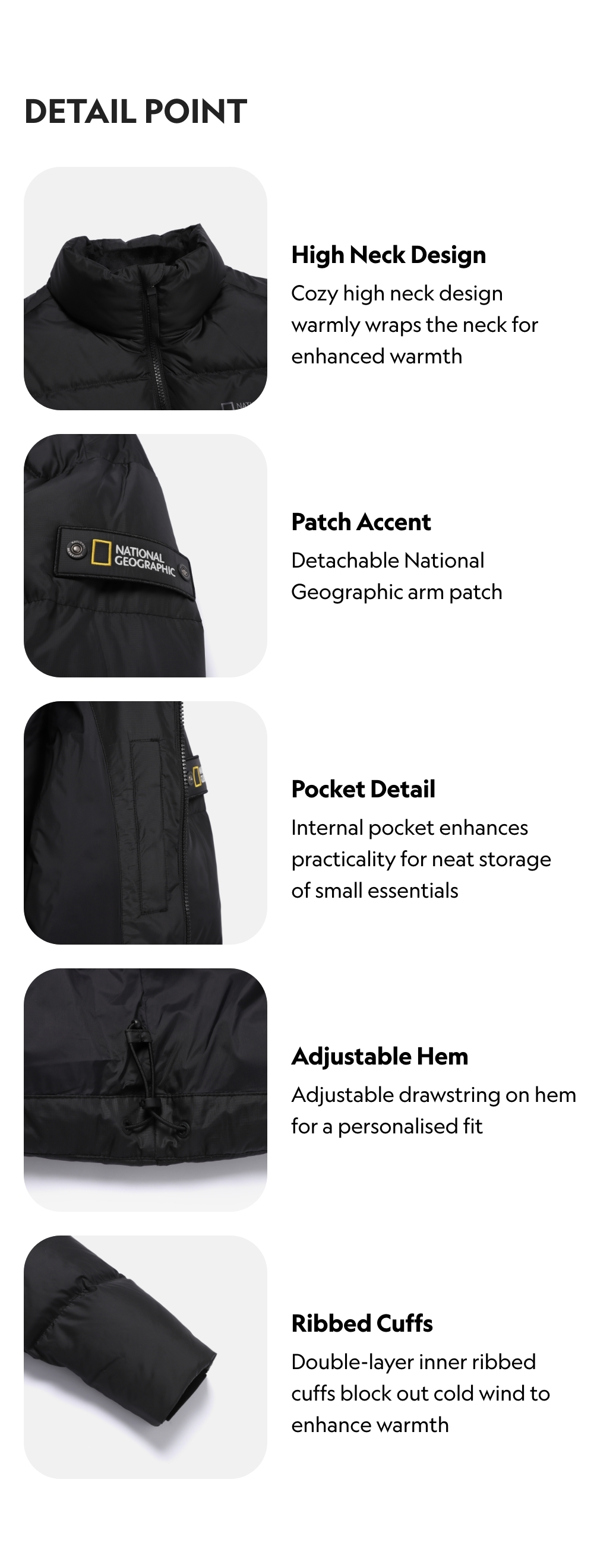 Cozy high neck design warmly wraps the neck for enhanced warmth
