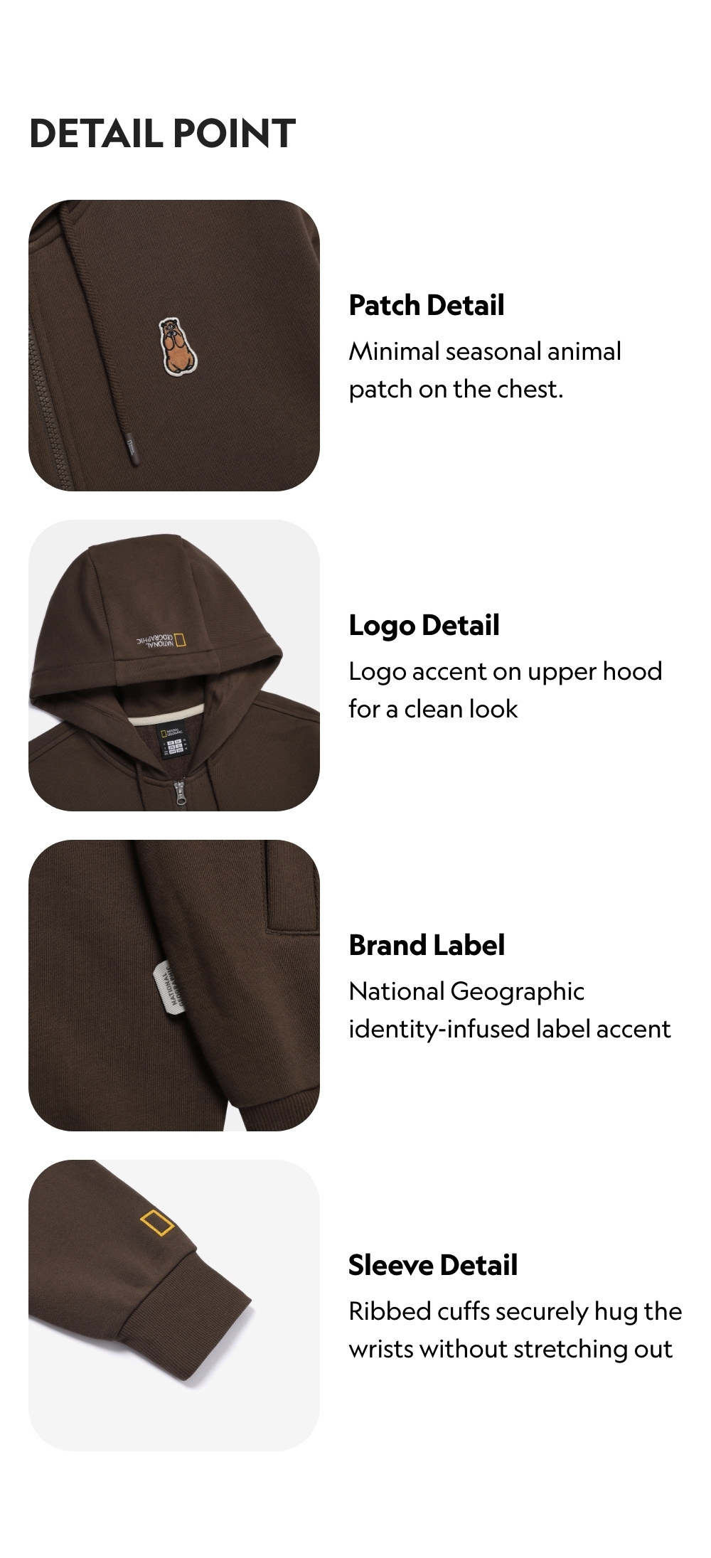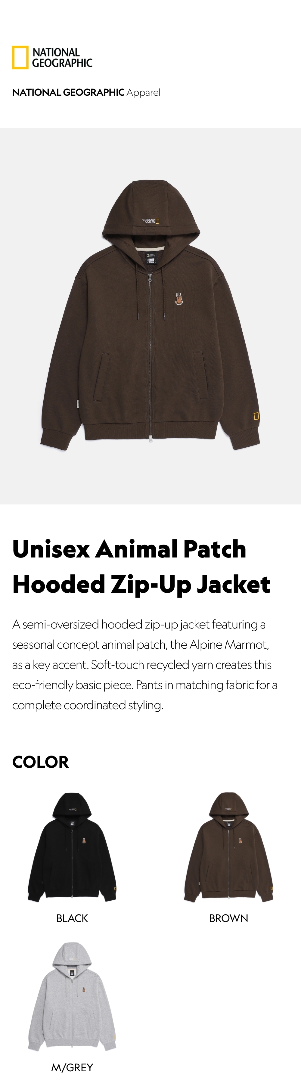A semi-oversized hooded zip-up jacket featuring a seasonal concept animal patch, the Alpine Marmot, as a key accent.