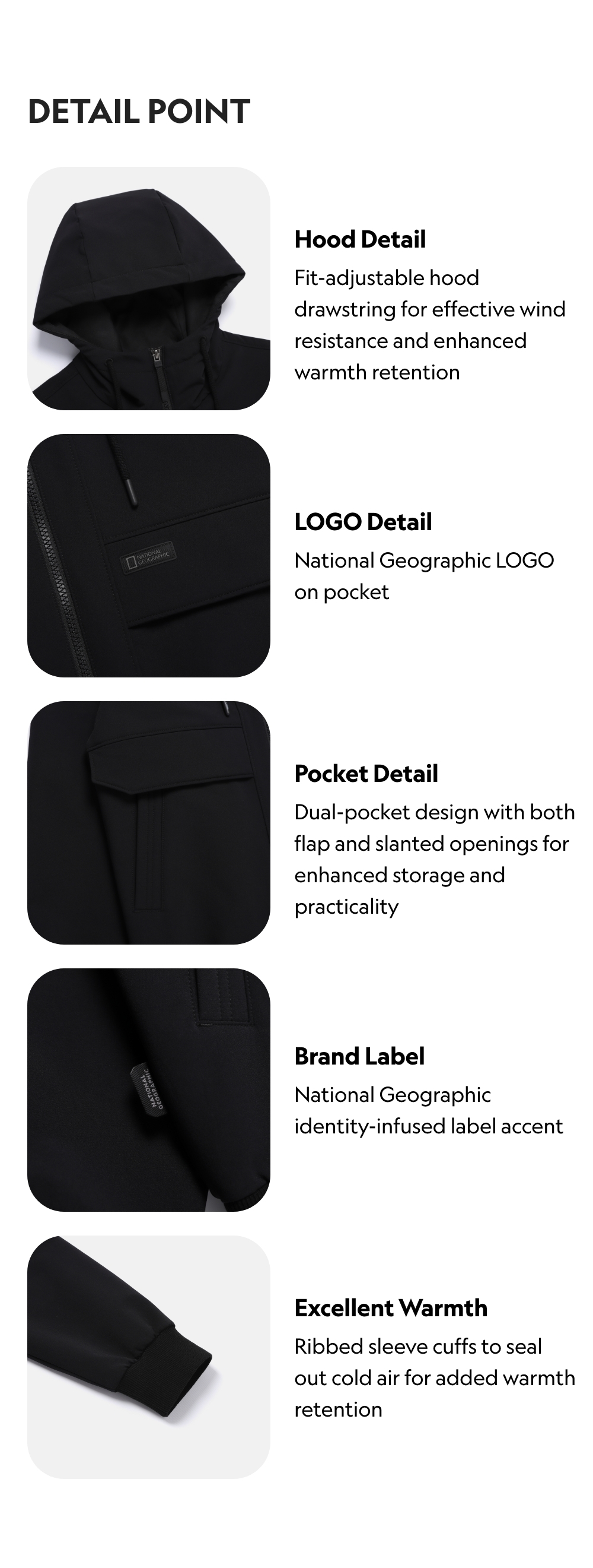 Fit-adjustable hood drawstring for effective wind resistance and enhanced warmth retention