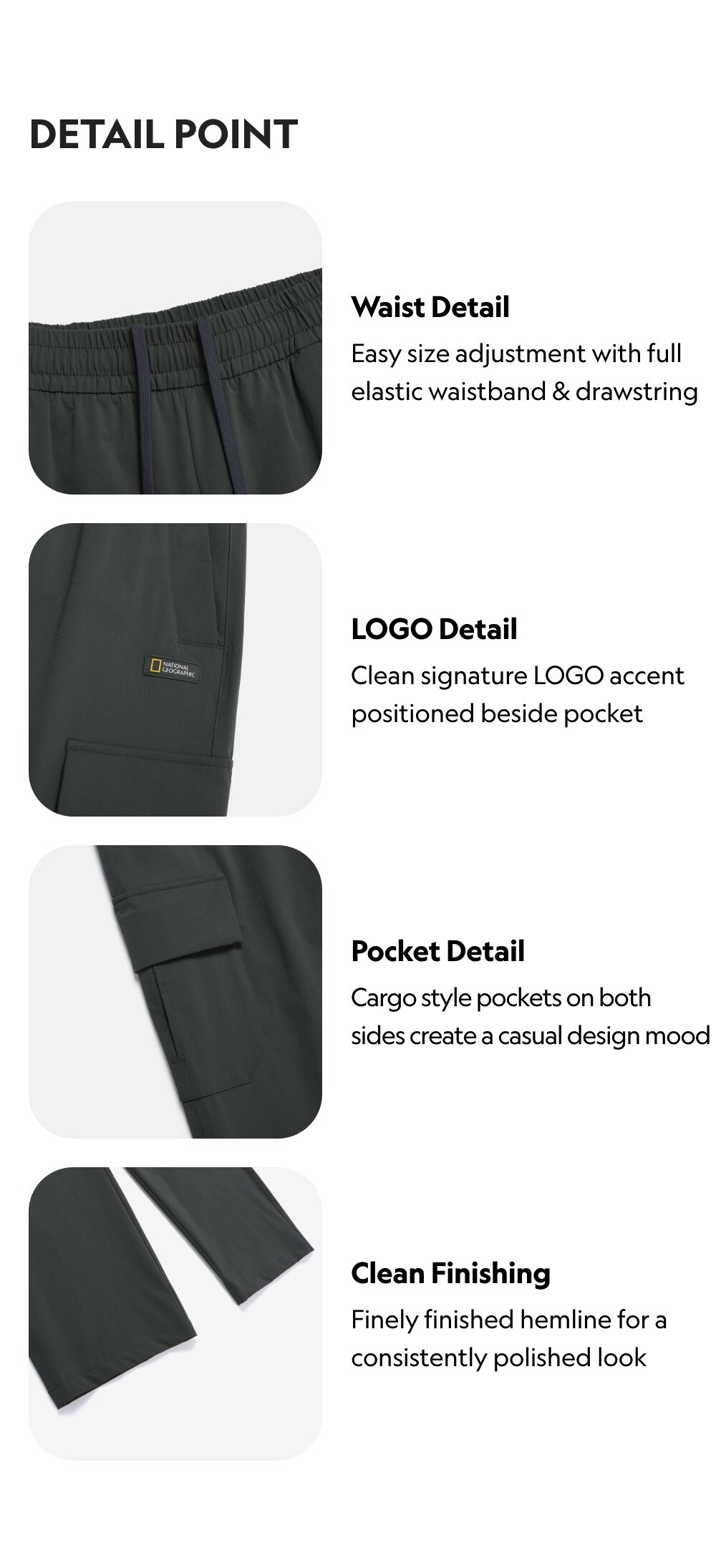 -Waist Detail: Easy size adjustment with full elastic waistband and drawstring