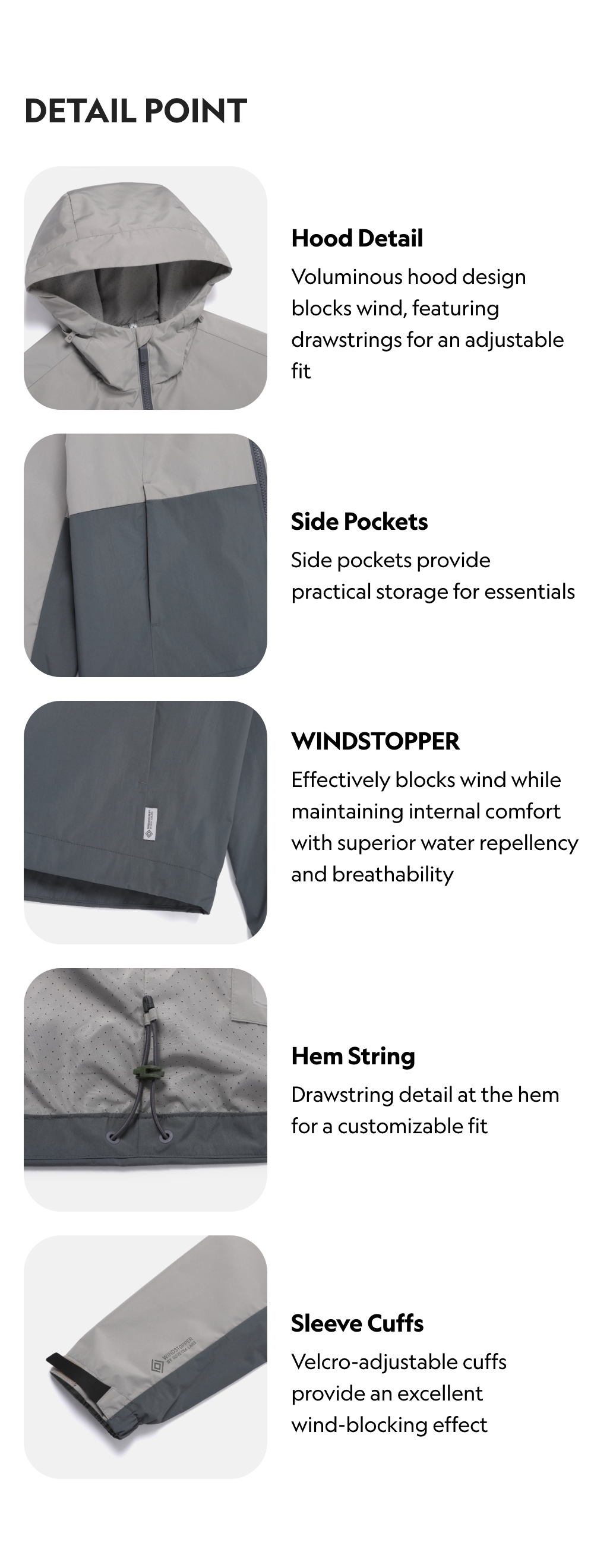Voluminous hood design blocks wind, featuring drawstrings for an adjustable fit
