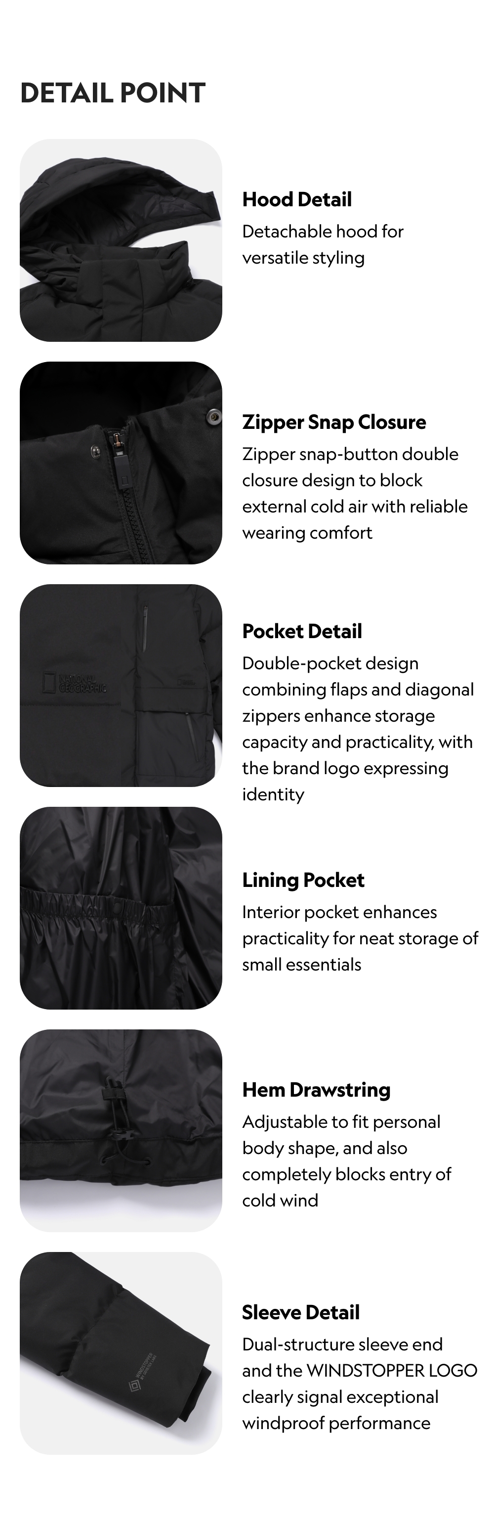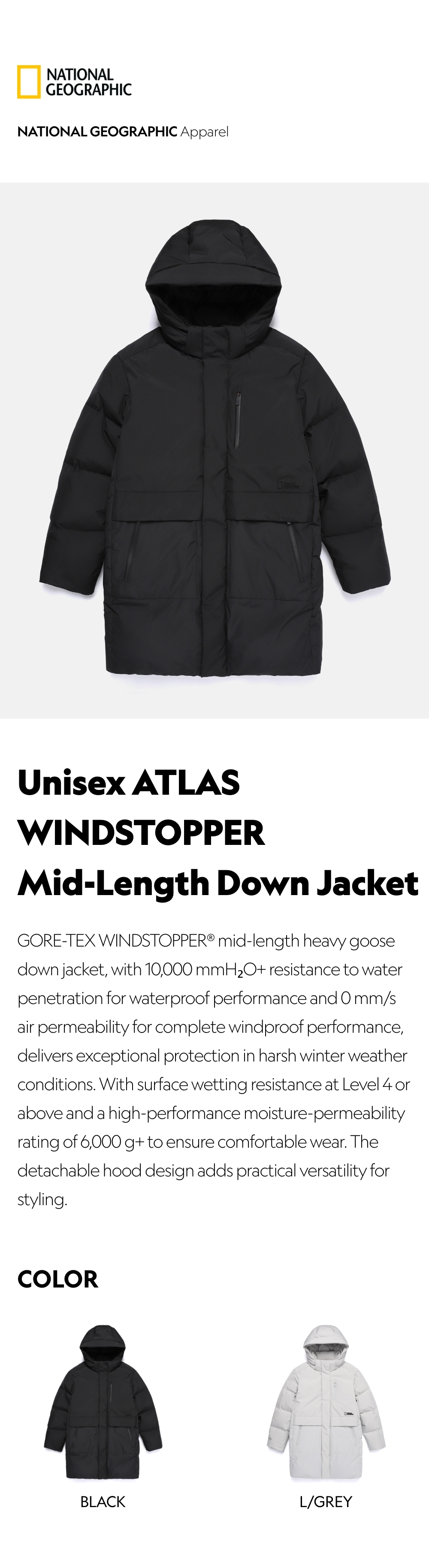 GORE-TEX WINDSTOPPER® mid-length heavy goose down jacket, with 10,000 mmH₂O+ resistance to water penetration for waterproof performance and 0 mm/s air permeability for complete windproof performance, delivers exceptional protection in harsh winter weather conditions.