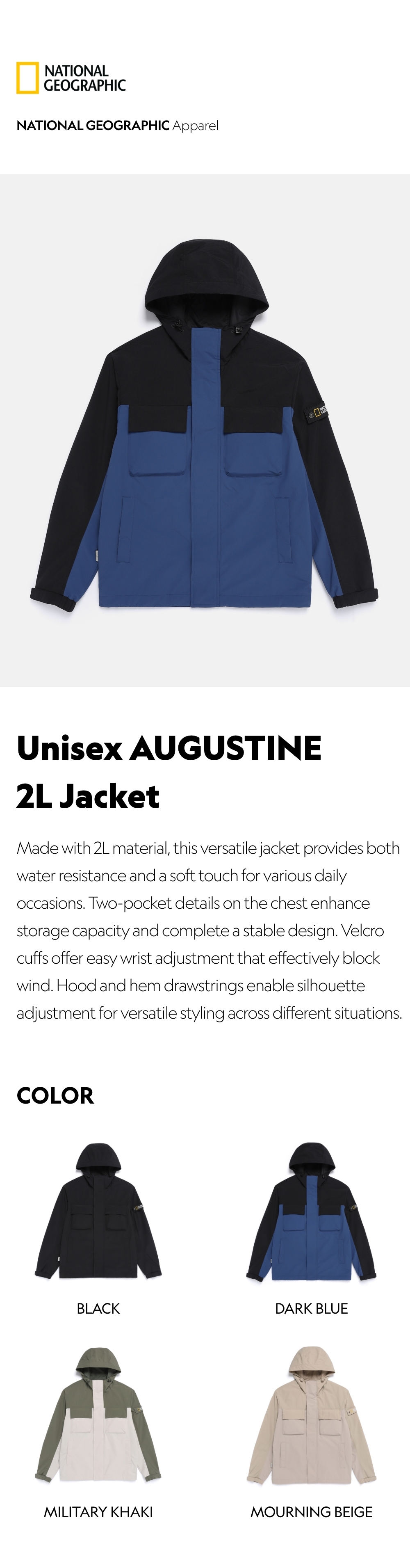 Made with 2L material, this versatile jacket provides both water resistance and a soft touch for various daily occasions. Two-pocket details on the chest enhance storage capacity and complete a stable design. Velcro cuffs offer easy wrist adjustment that effectively block wind. Hood and hem drawstrings enable silhouette adjustment for versatile styling across different situations.