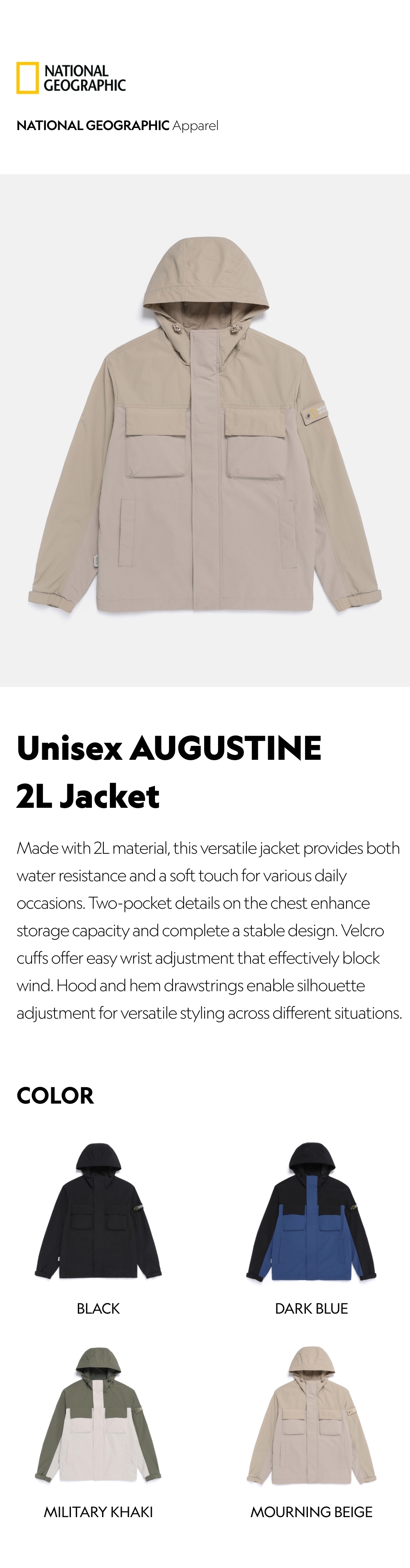 Made with 2L material, this versatile jacket provides both water resistance and a soft touch for various daily occasions. Two-pocket details on the chest enhance storage capacity and complete a stable design. Velcro cuffs offer easy wrist adjustment that effectively block wind. Hood and hem drawstrings enable silhouette adjustment for versatile styling across different situations.