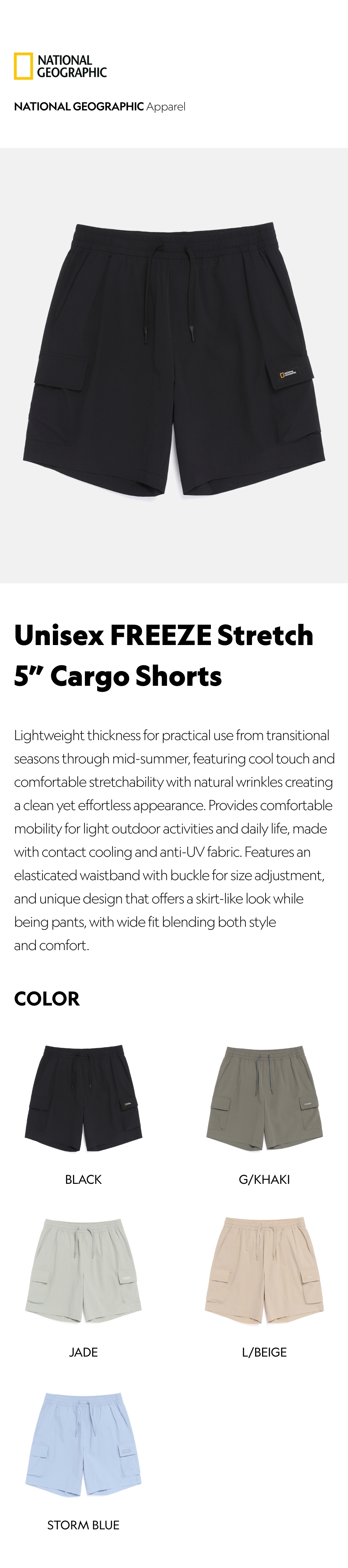 Lightweight thickness for practical use from transitional seasons through mid-summer, featuring cool touch and comfortable stretchability with natural wrinkles creating a clean yet effortless appearance. Provides comfortable mobility for light outdoor activities and daily life, made with contact cooling and anti-UV fabric. Features an elasticated waistband with buckle for size adjustment, and unique design that offers a skirt-like look while being pants, with wide fit blending both style and comfort.