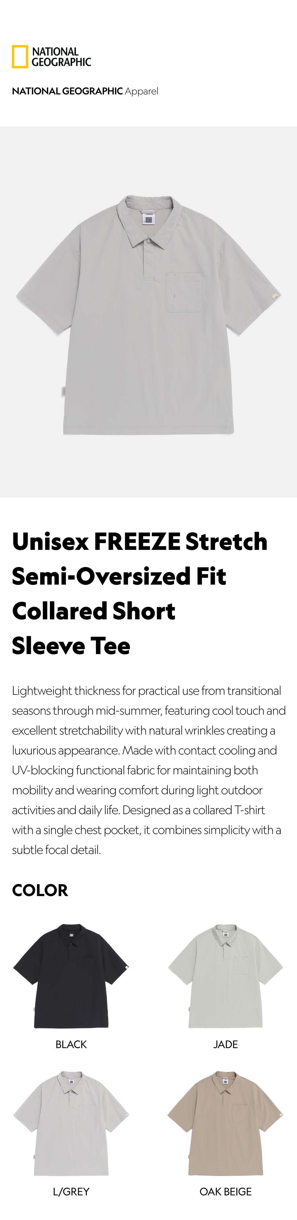 Lightweight thickness for practical use from transitional seasons through mid-summer, featuring cool touch and excellent stretchability with natural wrinkles creating a luxurious appearance. Made with contact cooling and UV-blocking functional fabric for maintaining both mobility and wearing comfort during light outdoor activities and daily life. Designed as a collared T-shirt with a single chest pocket, it combines simplicity with a subtle focal detail.