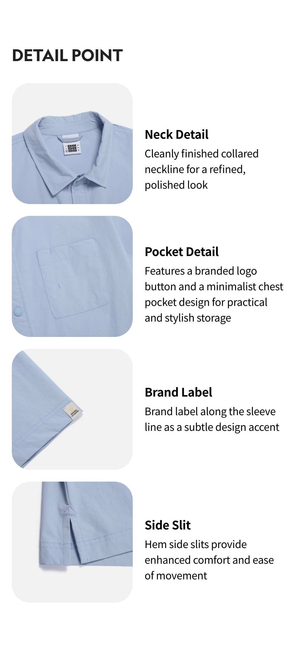 Lightweight thickness for practical use from transitional seasons through mid-summer, featuring cool touch and excellent stretchability with natural wrinkles creating a luxurious appearance. Made with contact cooling and UV-blocking functional fabric for maintaining both mobility and wearing comfort during light outdoor activities and daily life. Single chest pocket detail completes a simple yet focal design.