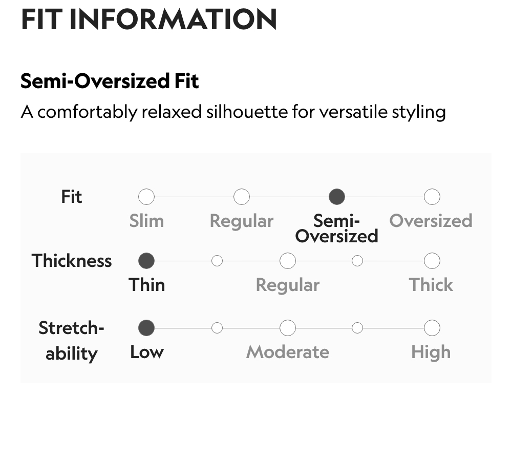 Semi-oversized fit / Thickness: Regular / Stretchability: Moderate