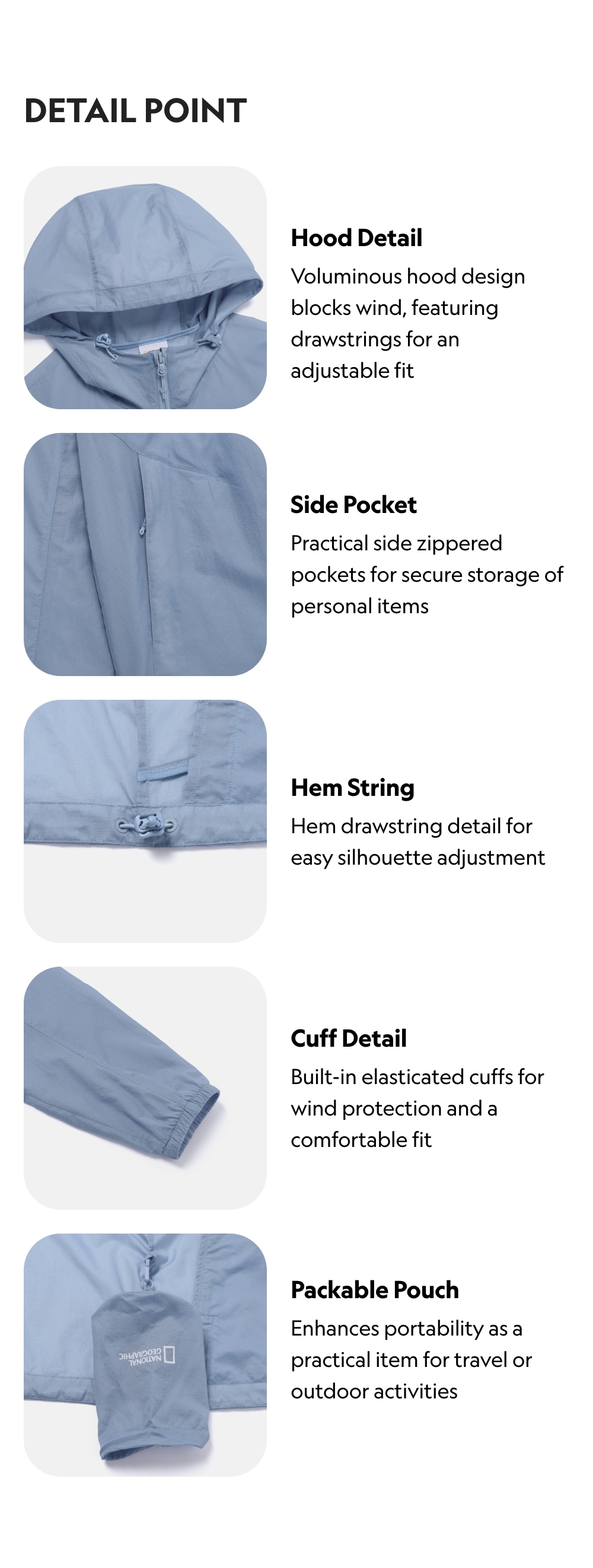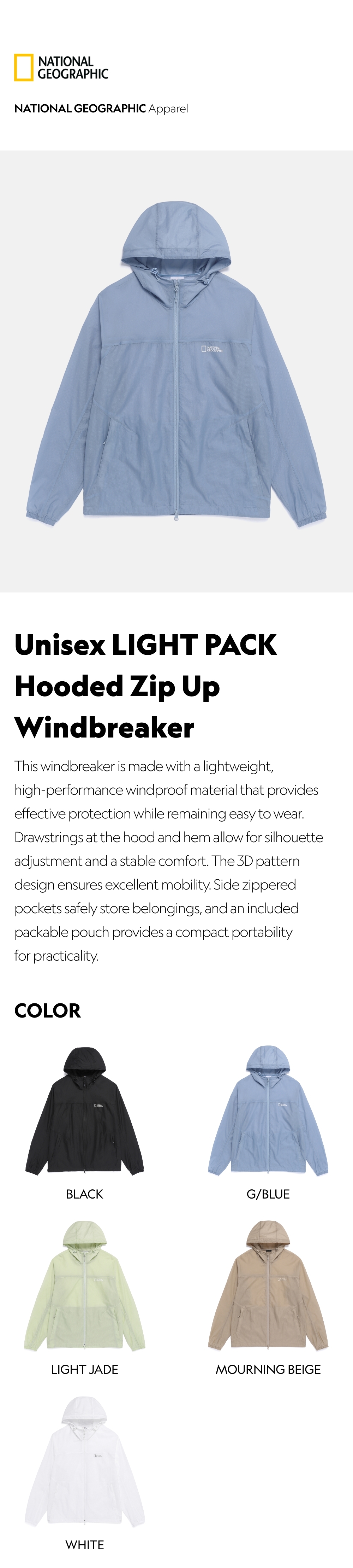 This windbreaker is made with a lightweight, high-performance windproof material that provides effective protection while remaining easy to wear. Drawstrings at the hood and hem allow for silhouette adjustment and a stable comfort. The 3D pattern design ensures excellent mobility. Side zippered pockets safely store belongings, and an included packable pouch provides a compact portability for practicality.