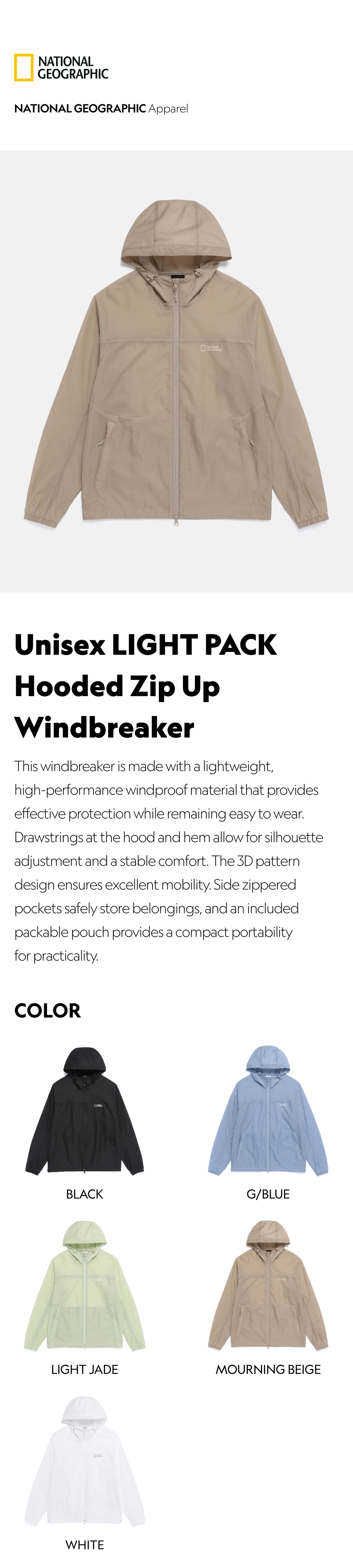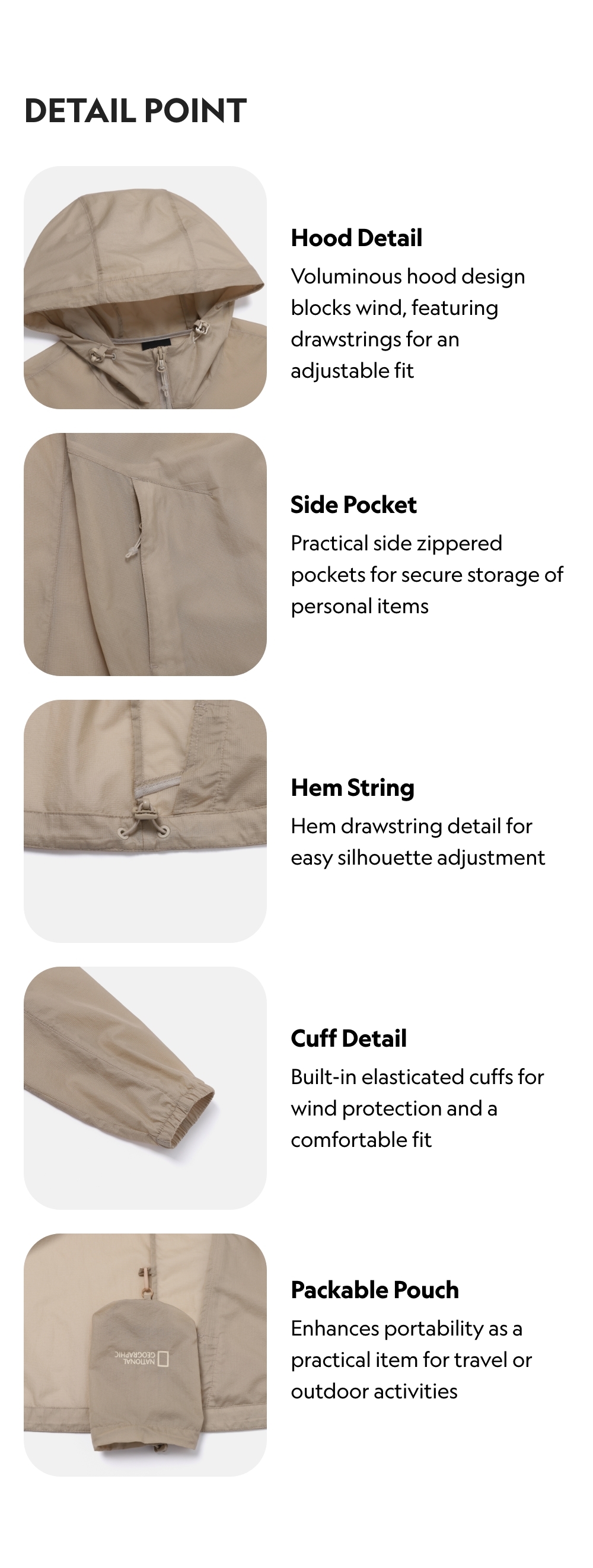 This windbreaker is made with a lightweight, high-performance windproof material that provides effective protection while remaining easy to wear. Drawstrings at the hood and hem allow for silhouette adjustment and a stable comfort. The 3D pattern design ensures excellent mobility. Side zippered pockets safely store belongings, and an included packable pouch provides a compact portability for practicality.