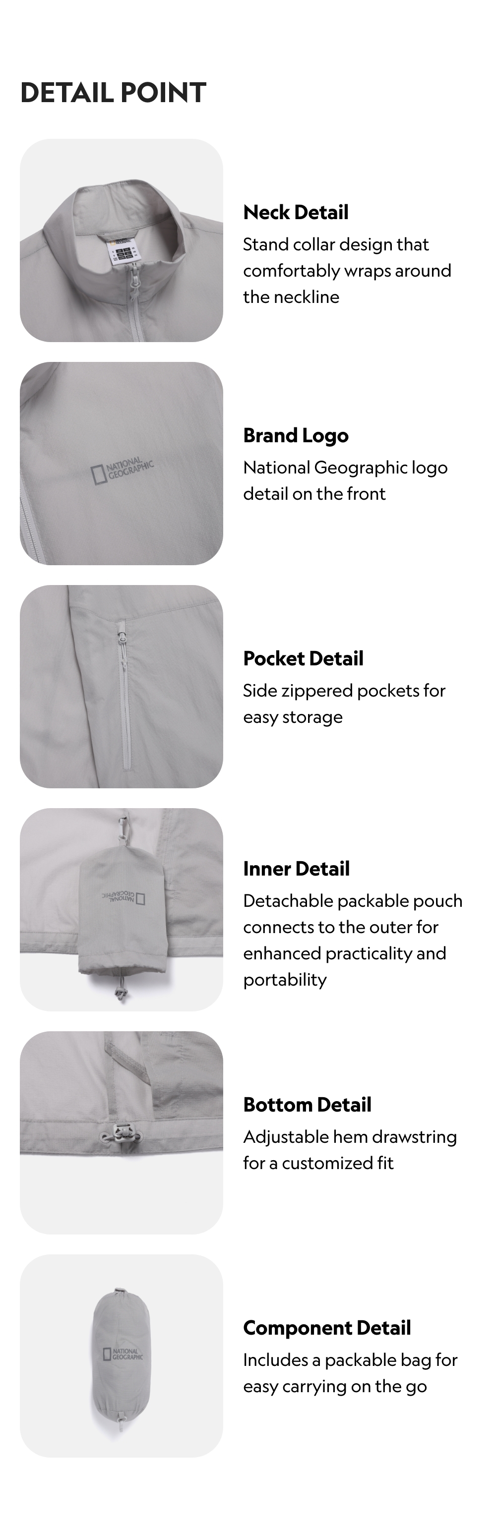 Made with lightweight fabric offering excellent windproof functionality. The hem drawstring enables silhouette adjustment and blocks wind, while the dimensional pattern design enhances mobility. The included packable pouch provides both portability and practicality, making this a versatile item for travel, commuting, and everyday wear.