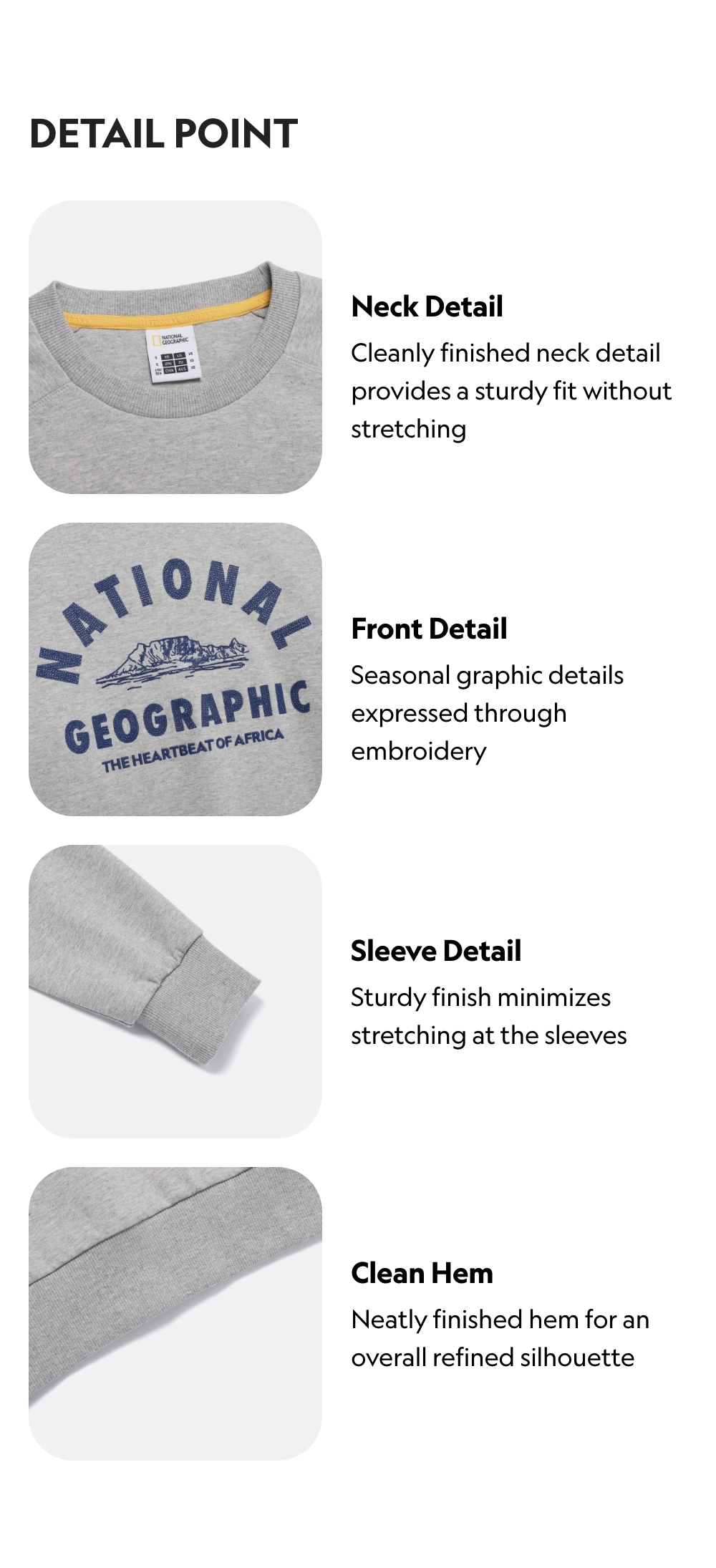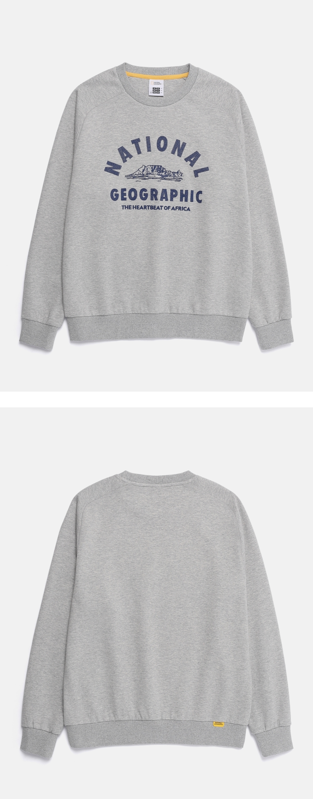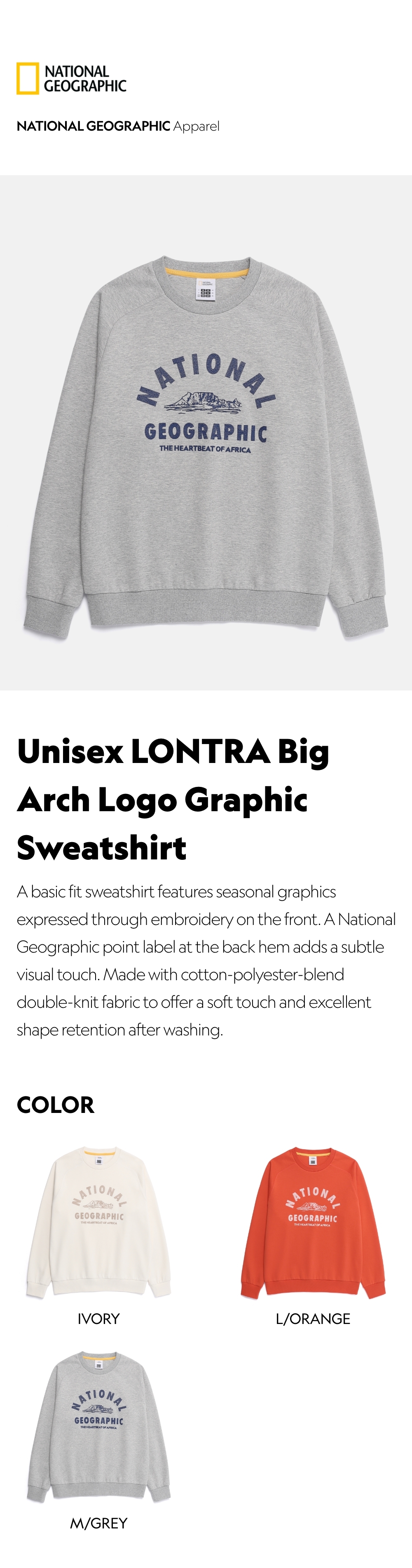 A basic fit sweatshirt features seasonal graphics expressed through embroidery on the front. A National Geographic point label at the back hem adds a subtle visual touch. Made with cotton-polyester-blend double-knit fabric to offer a soft touch and excellent shape retention after washing.