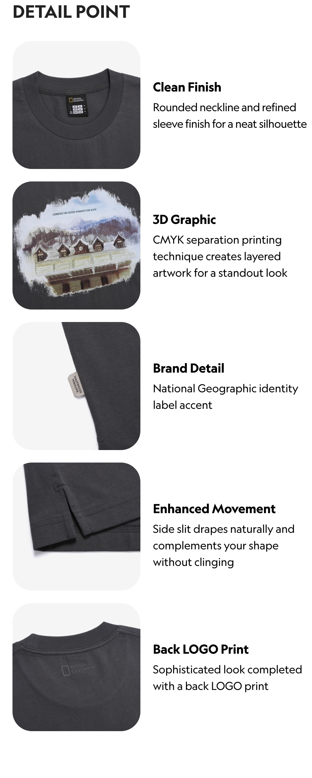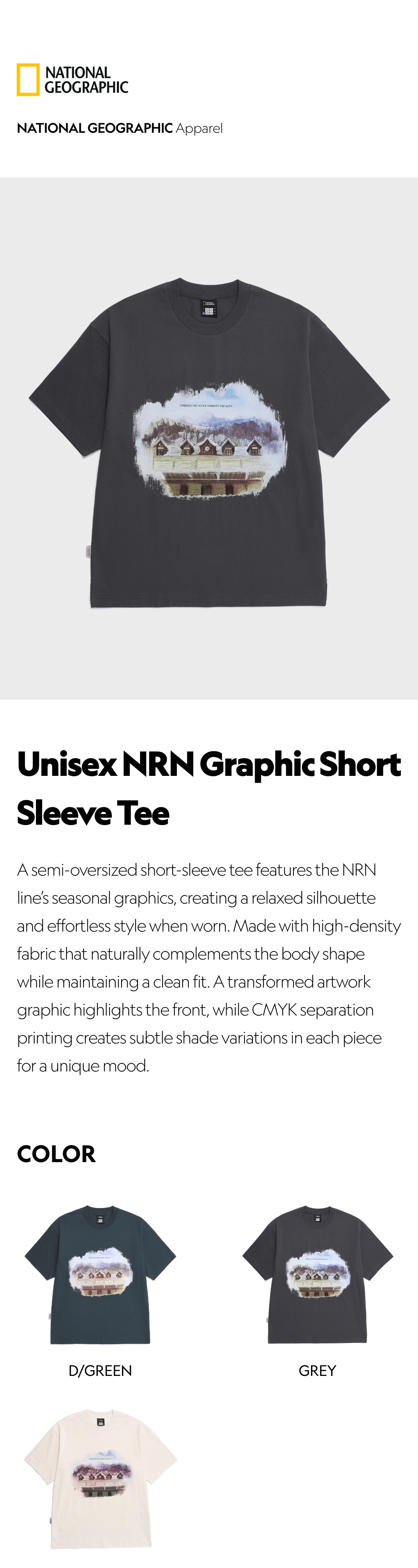 - A semi-oversized short-sleeve tee features the NRN line's seasonal graphics, creating a relaxed silhouette and effortless style when worn. Made with high-density fabric that naturally complements the body shape while maintaining a clean fit. A transformed artwork graphic highlights the front, while CMYK separation printing creates subtle shade variations in each piece for a unique mood.