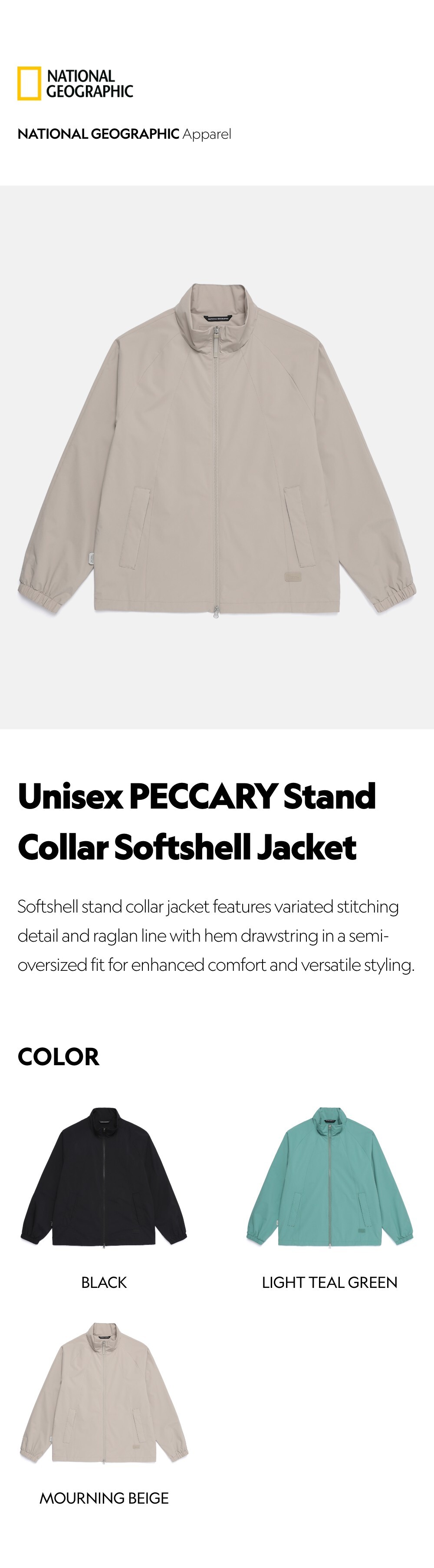 Softshell stand collar jacket features variated stitching detail and raglan line with hem drawstring in a semi-oversized fit for enhanced comfort and versatile styling.
