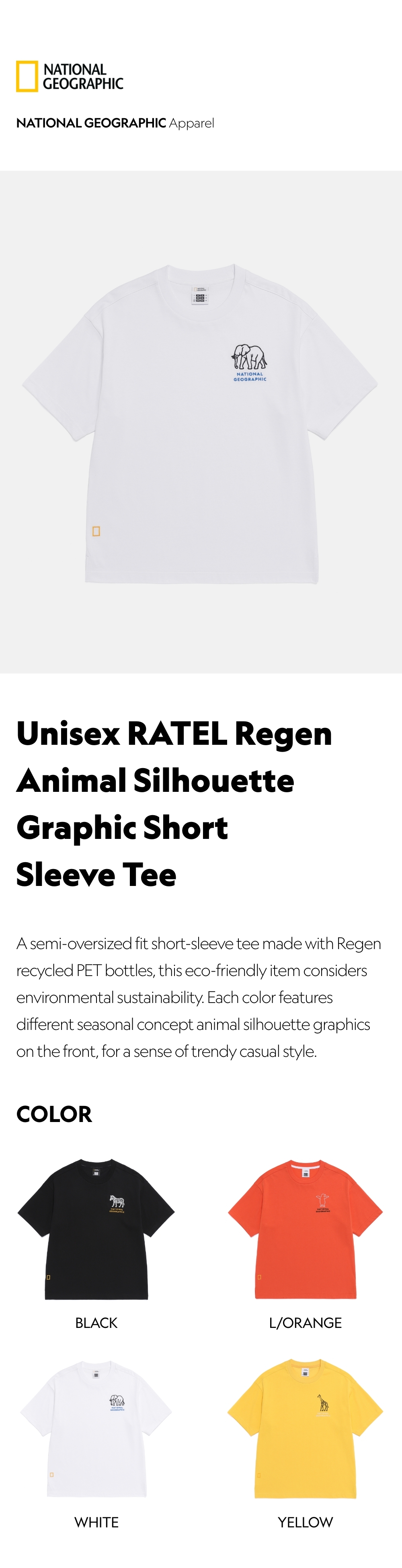 A semi-oversized fit short-sleeve tee made with Regen recycled PET bottles, this eco-friendly item considers environmental sustainability. Each color features different seasonal concept animal silhouette graphics on the front, for a sense of trendy casual style.