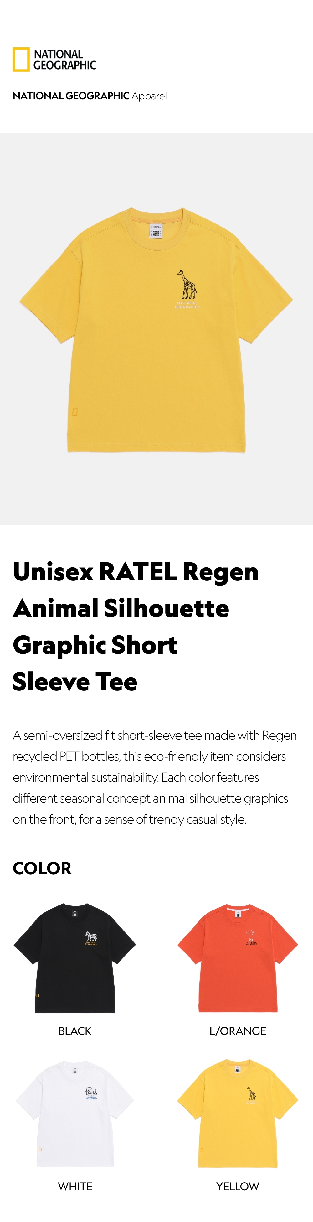 A semi-oversized fit short-sleeve tee made with Regen recycled PET bottles, this eco-friendly item considers environmental sustainability. Each color features different seasonal concept animal silhouette graphics on the front, for a sense of trendy casual style.