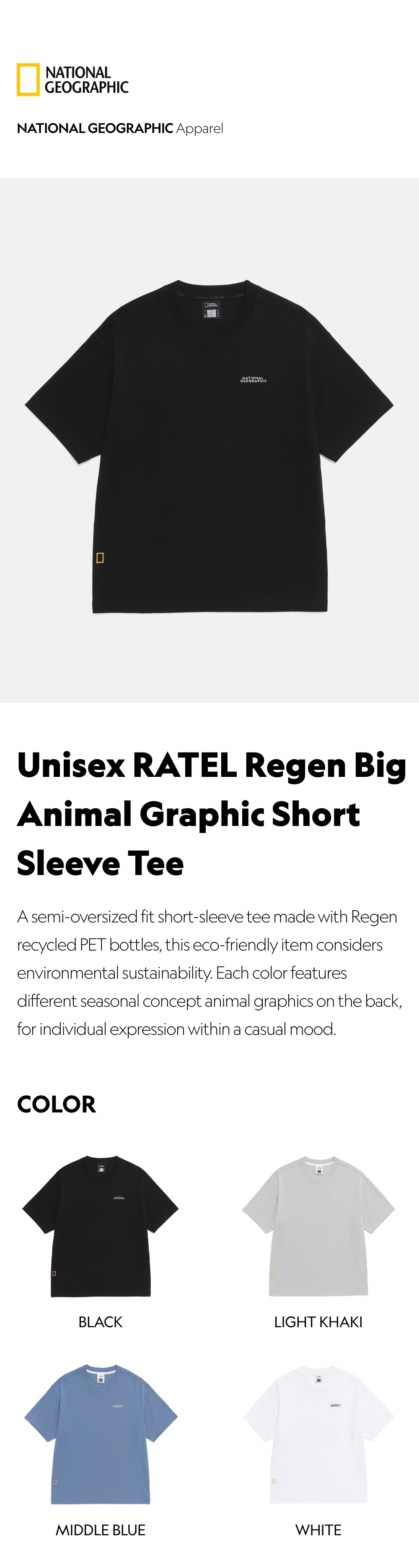 A semi-oversized fit short-sleeve tee made with Regen recycled PET bottles, this eco-friendly item considers environmental sustainability. Each color features different seasonal concept animal graphics on the back, for individual expression within a casual mood.