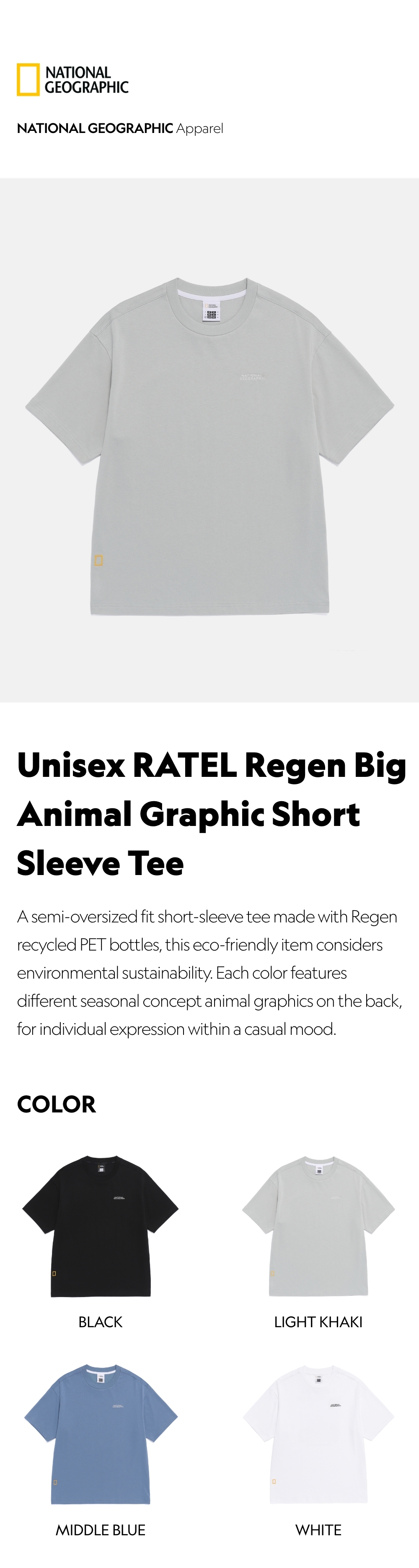 A semi-oversized fit short-sleeve tee made with Regen recycled PET bottles, this eco-friendly item considers environmental sustainability. Each color features different seasonal concept animal graphics on the back, for individual expression within a casual mood.