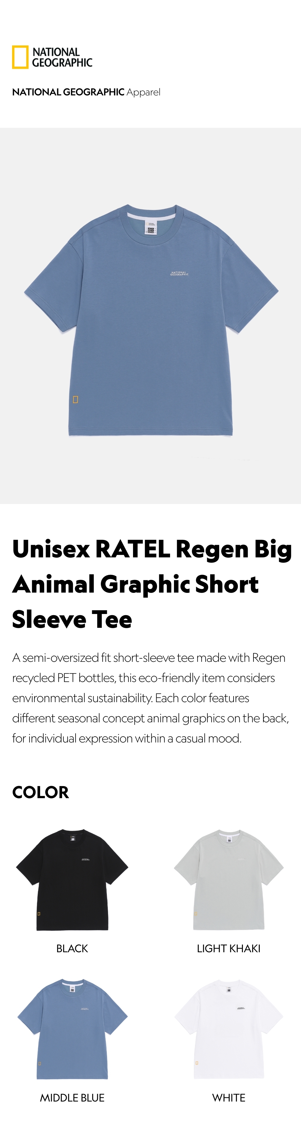 A semi-oversized fit short-sleeve tee made with Regen recycled PET bottles, this eco-friendly item considers environmental sustainability. Each color features different seasonal concept animal graphics on the back, for individual expression within a casual mood.