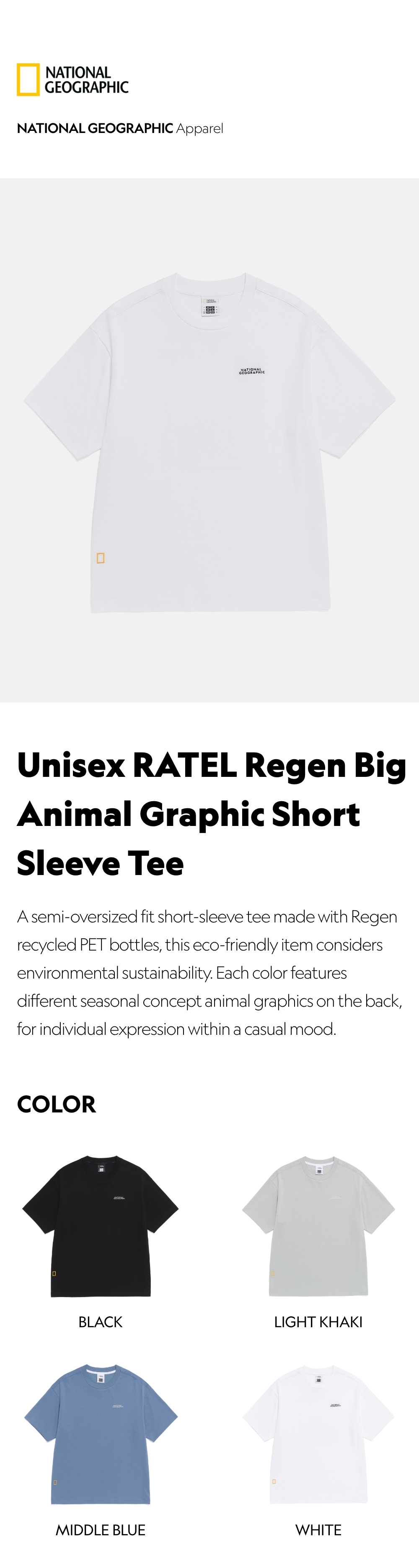 A semi-oversized fit short-sleeve tee made with Regen recycled PET bottles, this eco-friendly item considers environmental sustainability. Each color features different seasonal concept animal graphics on the back, for individual expression within a casual mood.