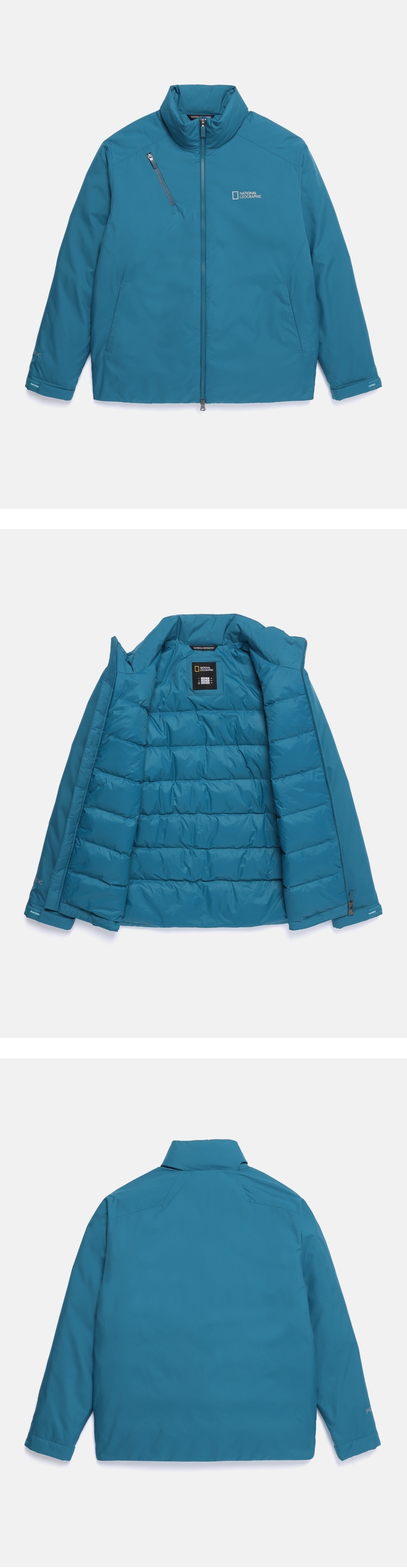 Basic fit silhouette with high-neck design for versatile styling as either an inner layer or standalone outerwear.