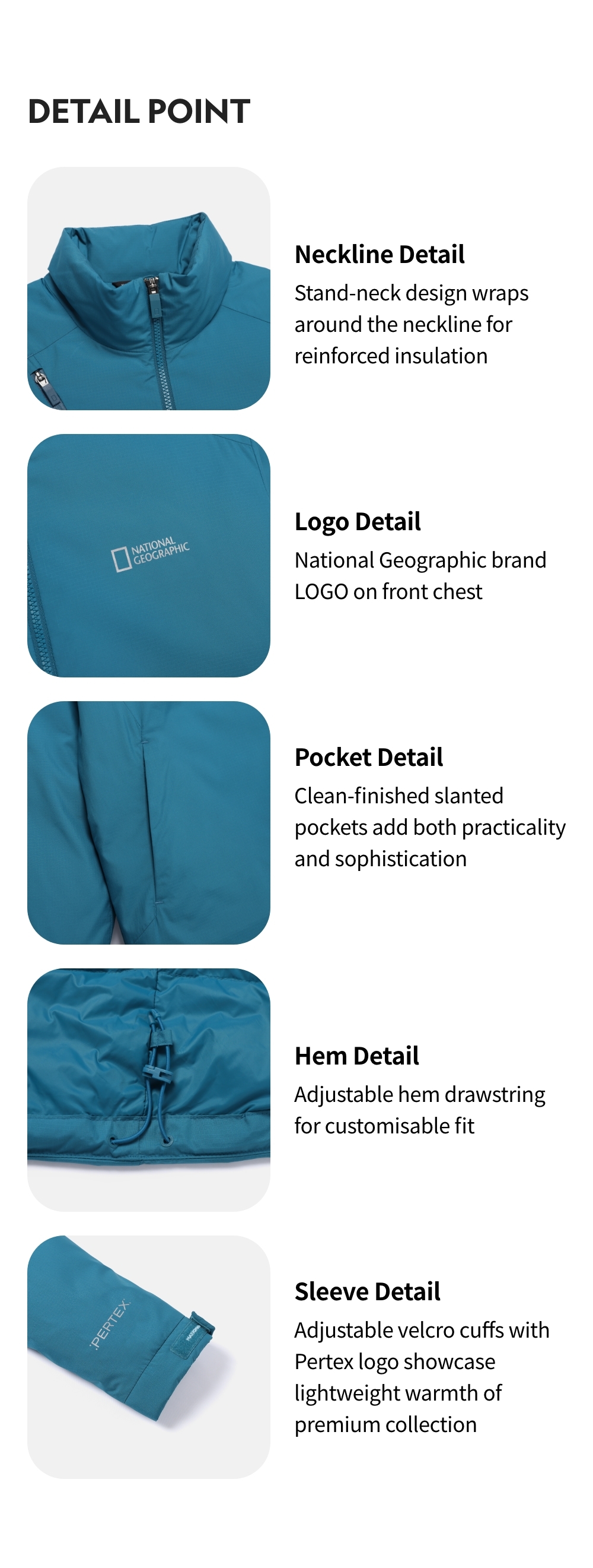 Stand-neck design wraps around the neckline for reinforced insulation
