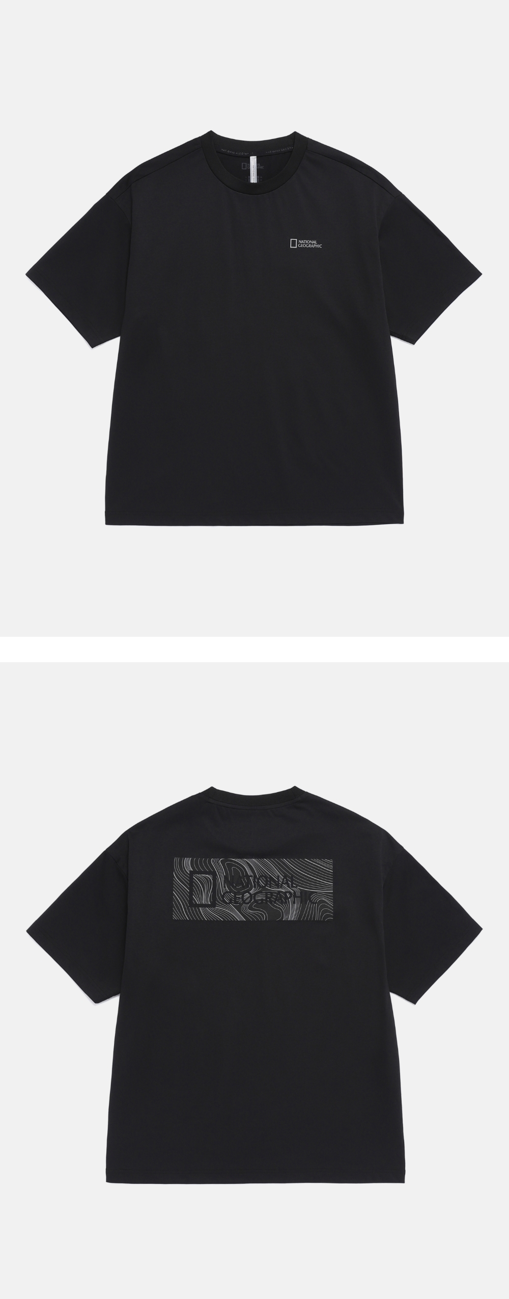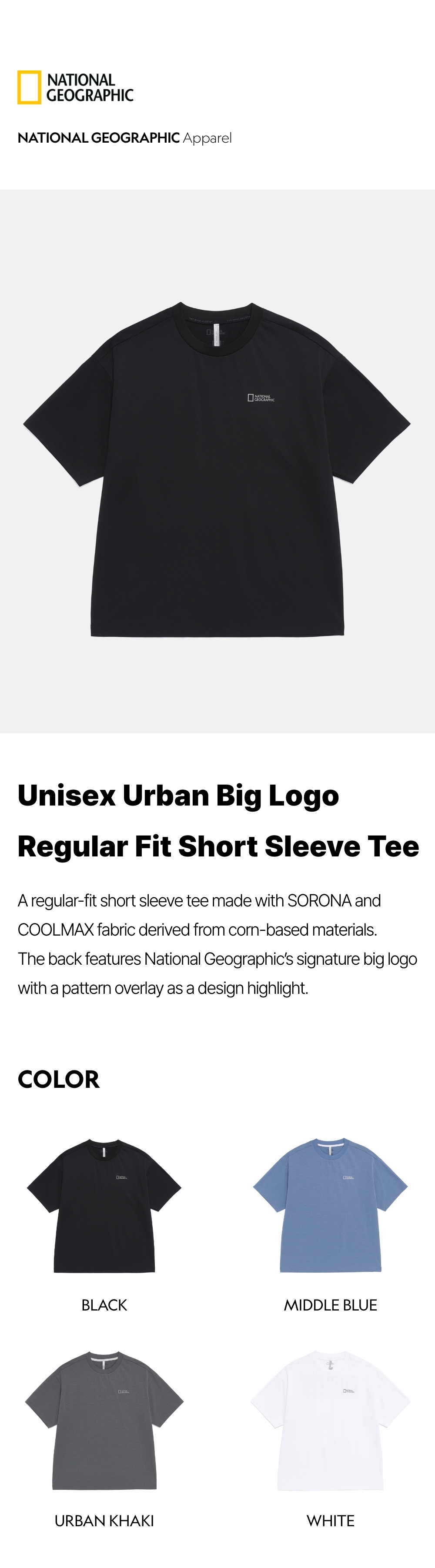 A regular-fit short sleeve tee made with SORONA and COOLMAX fabric derived from corn-based materials. The back features National Geographic's signature big logo with a pattern overlay as a design highlight.