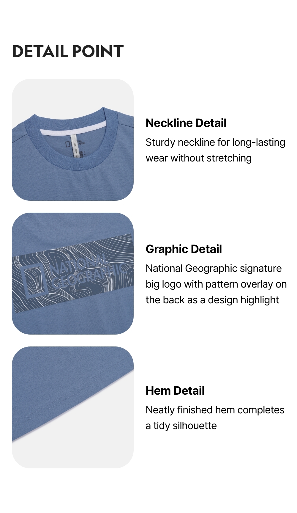 A regular-fit short sleeve tee made with SORONA and COOLMAX fabric derived from corn-based materials. The back features National Geographic's signature big logo with a pattern overlay as a design highlight.