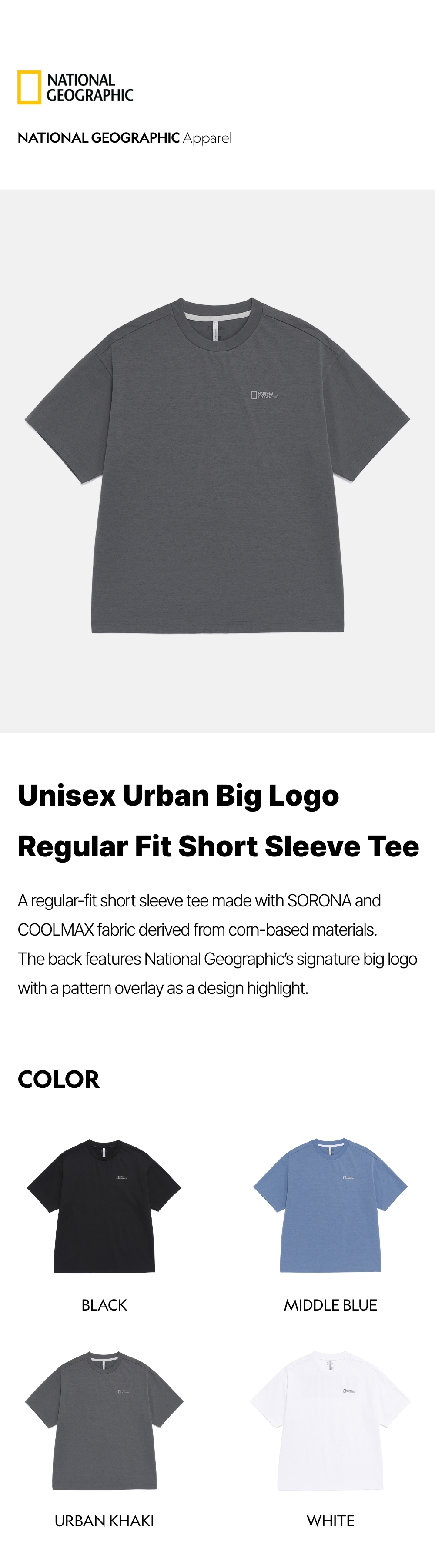 A regular-fit short sleeve tee made with SORONA and COOLMAX fabric derived from corn-based materials. The back features National Geographic's signature big logo with a pattern overlay as a design highlight.