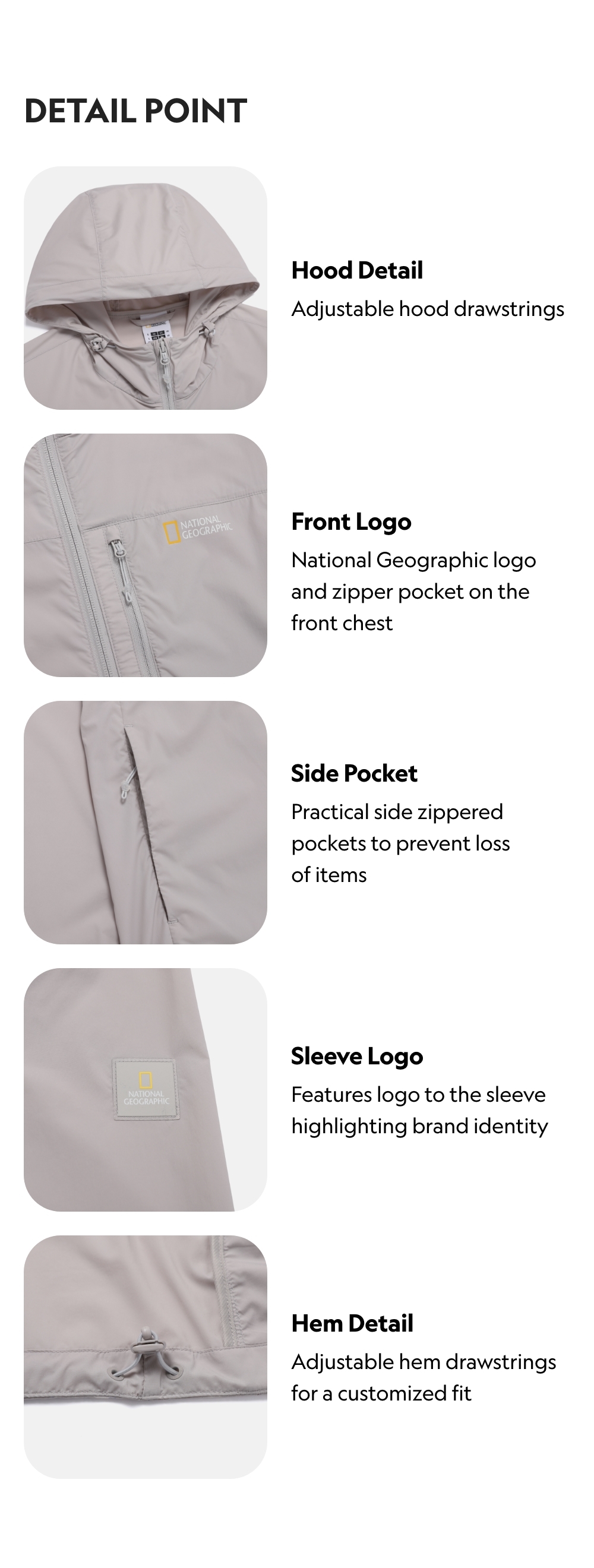 A lightweight windbreaker item that is perfect for casual wear. Drawstrings at the hood and hem enable silhouette adjustment and minimize wind entry. Designed with chest and side zippered pockets for secure storage to prevent loss of belongings. This highly portable lightweight jacket offers versatile use from daily wear to outdoor activities.