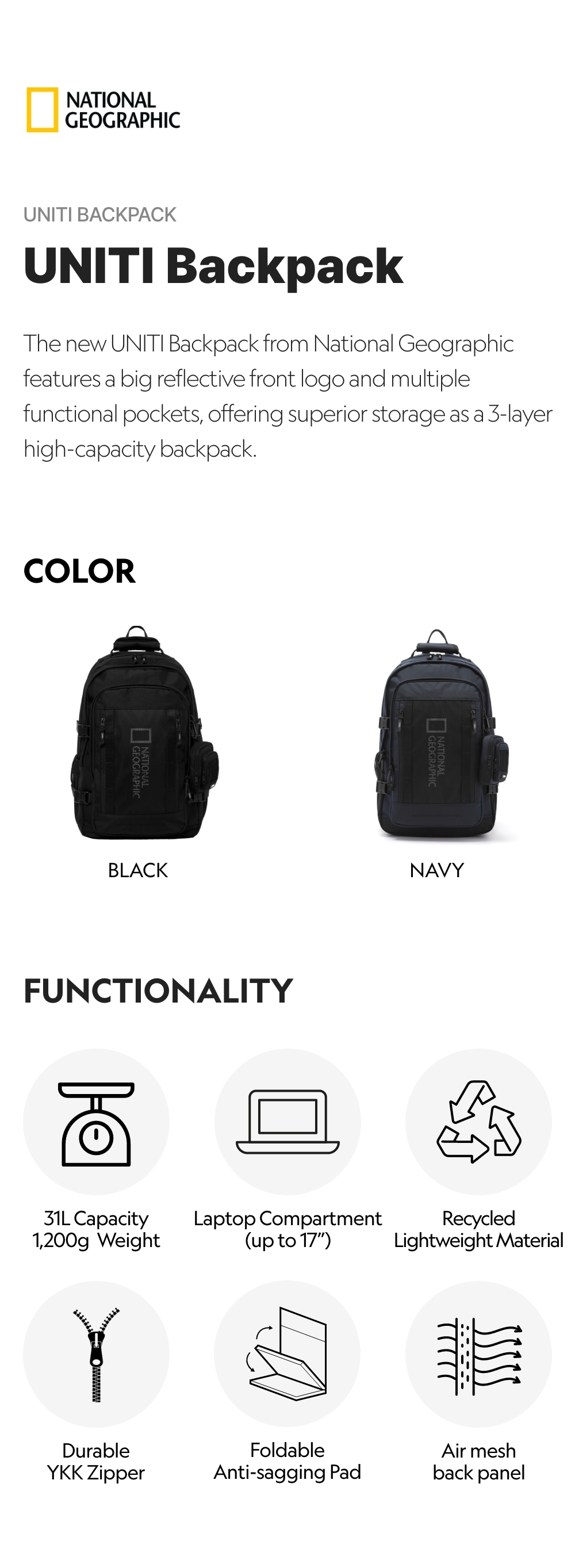 The new UNITI Backpack from National Geographic features a big reflective front logo and multiple functional pockets, offering superior storage as a 3-layer high-capacity backpack.
