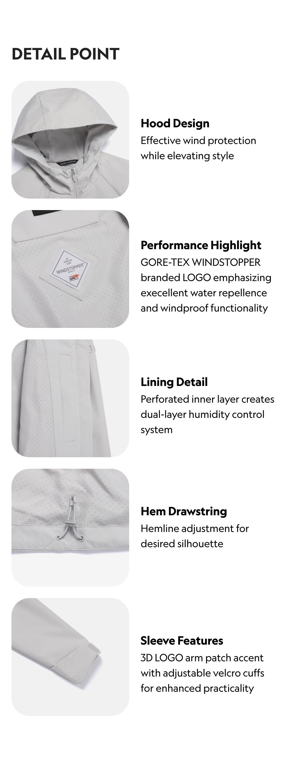 -Performance Highlight: GORE-TEX WINDSTOPPER branded LOGO emphasizing execellent water repellence and windproof functionality